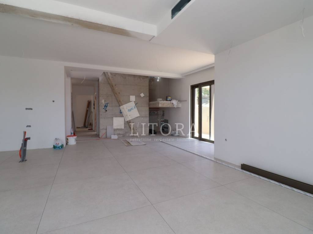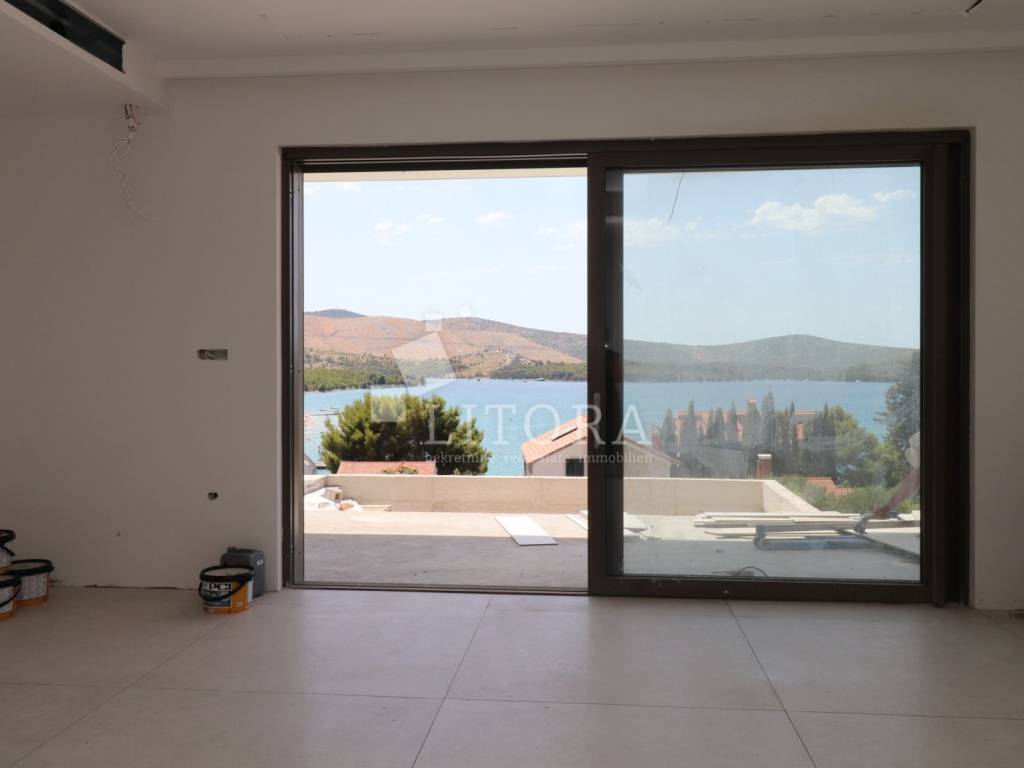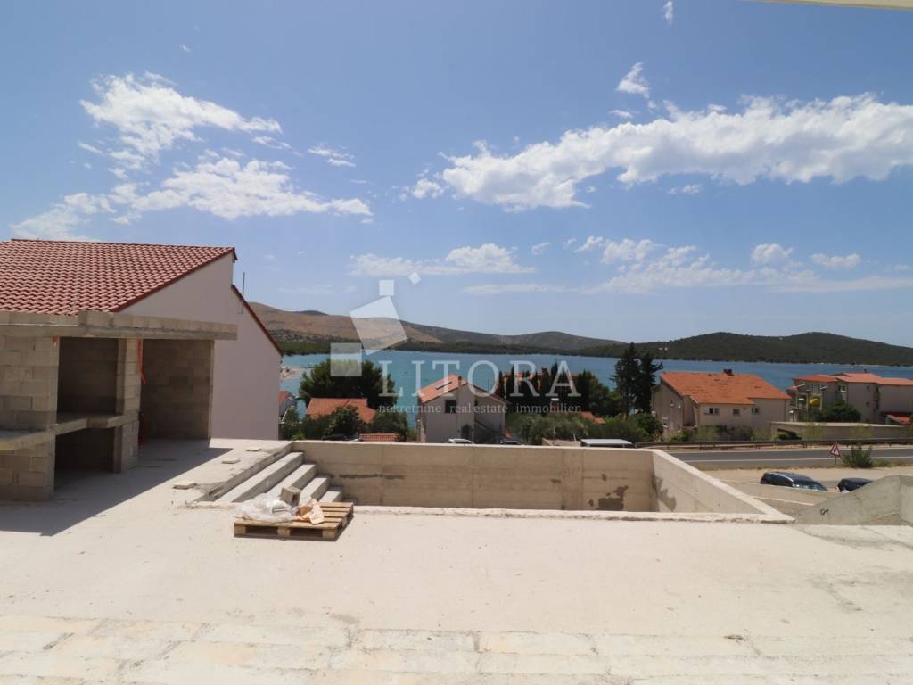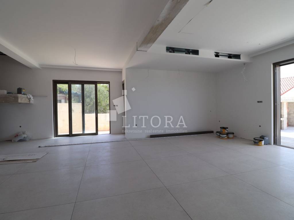 Modern Villa with Panoramic Sea View – Žaborić. Located in an attractive area of Žaborić, just 150 meters from a well-maintained beach, this luxurious villa of modern architectural design perfectly combines top-tier style, functionality, and elegance. With a total usable area of 209.94 m² (of which 177.46 m² refers to the villa itself), the property is set on a 720 m² plot and has been thoughtfully designed to provide maximum comfort, privacy, and enjoyment of the natural beauty of the Mediterranean surroundings. The villa is spread over two floors. The ground floor features an entrance hall leading into a spacious open-plan living room with a kitchen and dining area, a space filled with natural light and warmth. From the living room, there is access to an elegant terrace with a lounge area, sunbathing deck, and a 32 m² swimming pool – perfect for relaxing and entertaining. This level also includes one bedroom, a bathroom, and an additional room that can serve as a home office or guest room, depending on the future owner’s needs. Upstairs, there are three modern and stylish bedrooms, each with its own private bathroom. The bedrooms on the southern side open onto a terrace that offers beautiful sea views. An additional bathroom on this floor further enhances the villa’s practicality and comfort. The exterior of the villa is meticulously landscaped and fully fenced, offering a sense of privacy and security. Due to the terrain’s natural slope, the lower level of the yard includes a garage for two cars and additional parking space for four more vehicles, ensuring ample room for both family and guests. This property is ideal for those seeking a luxurious and modern home for permanent living or vacation, with an emphasis on comfort and proximity to the sea. Situated in a peaceful and well-maintained part of Žaborić, the villa offers everything needed for a high-quality lifestyle on the Adriatic, whether as a primary residence, a summer retreat, or a premium investment in tourist rental.