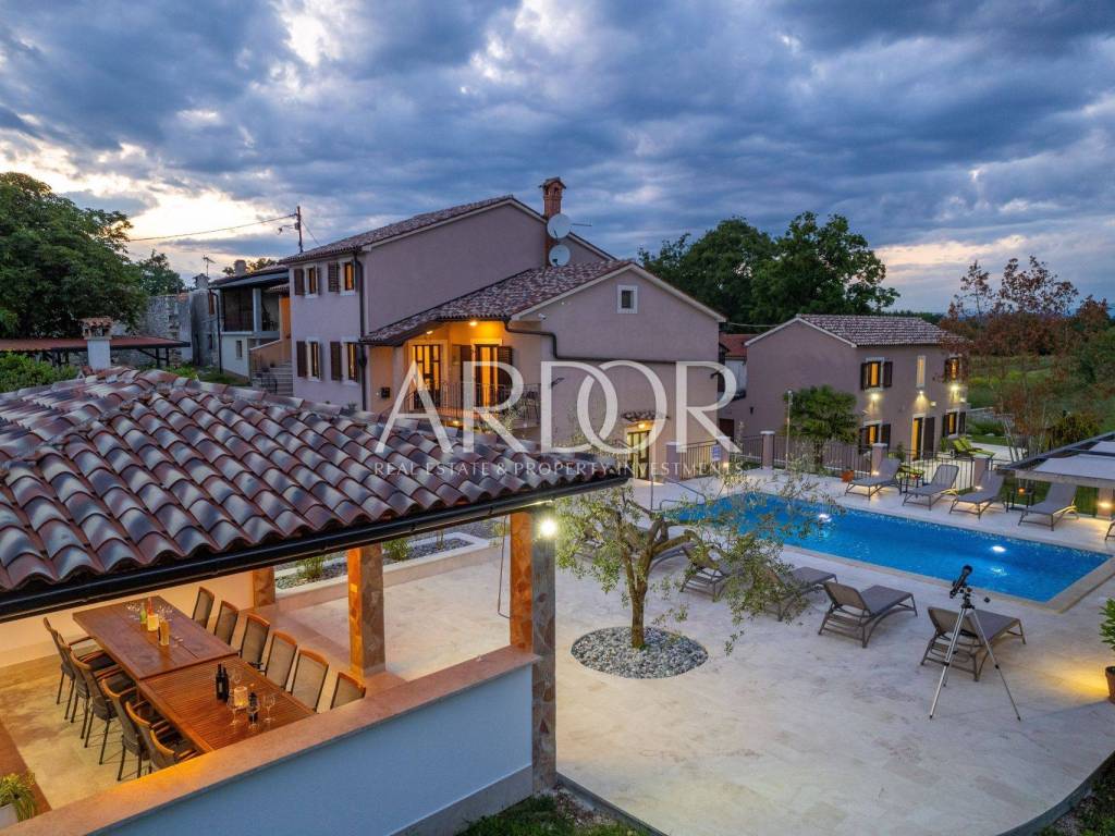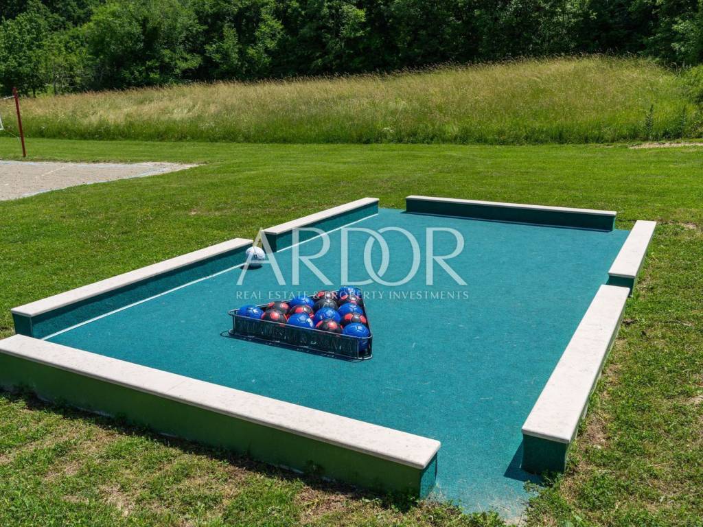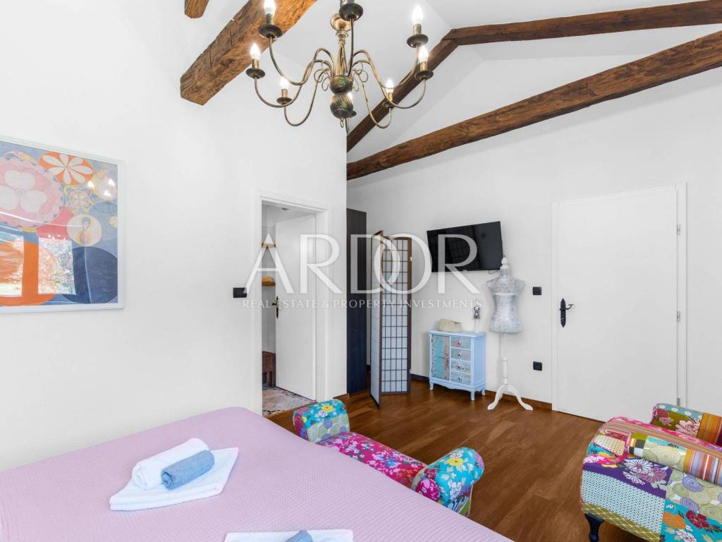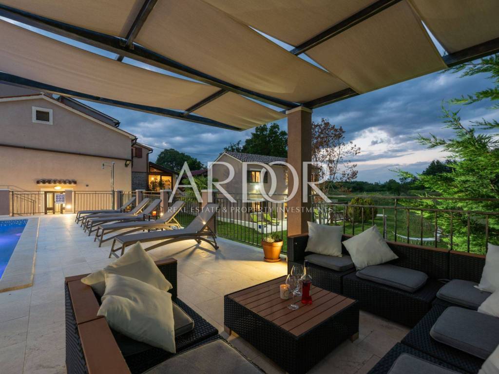 A ten minute drive to Rovinj separates you from this modern villa with traditional elements. The area is 388 m2, with a garden of 5,383 m2, which, together with the villa, forms a unique whole with many possibilities in the future.