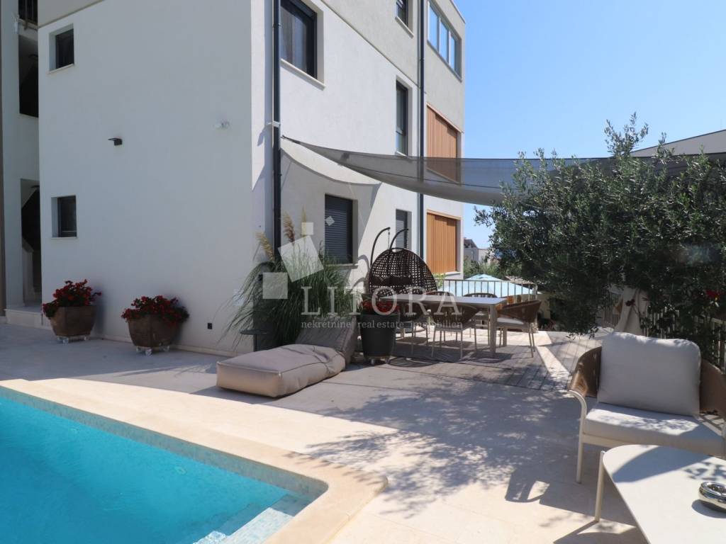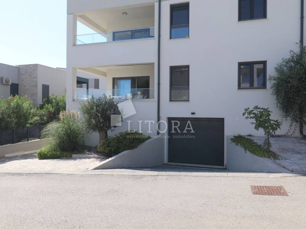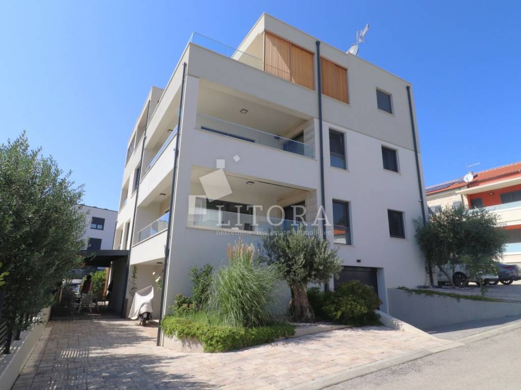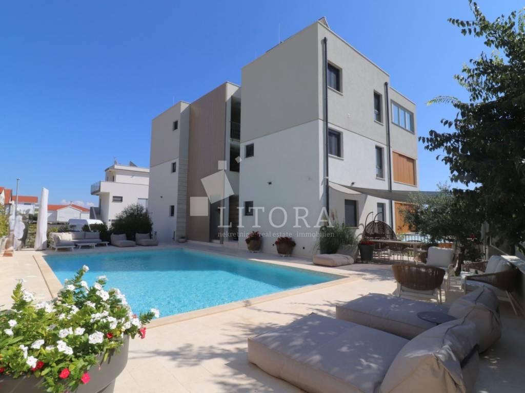 A newly built residential building with a total of four housing units, a spacious basement area and a garage space for several vehicles. The property consists of four levels: basement, ground floor, first floor and second floor with total of 477m2 usable area. The building is newly constructed with top-quality materials, situated on a plot of 629 m². In the courtyard there is a 60 m² swimming pool with counter-current swimming and heating option, an outdoor shower, barbecue, and a spacious parking area. The garden is landscaped and enriched with Mediterranean plants and trees. In the basement there is a recreation area, garage space for three vehicles, a boiler room and three storage rooms. On the ground floor there are two separate two-bedroom apartments, each with a large loggia. The first floor features a comfortable three-bedroom apartment with two terraces and sea views, while the second floor offers a spacious two-bedroom apartment with a large terrace providing panoramic views of the sea and the town of Vodice. The building is fully furnished with high-quality, custom-made furniture. It is equipped with underfloor heating throughout, high-quality ceramic flooring, parts of the facade are clad in natural stone, and the aluminum joinery with triple glazing includes shutters, insect screens and electric shutter lifts. The property also has space and predisposition for the installation of an elevator.