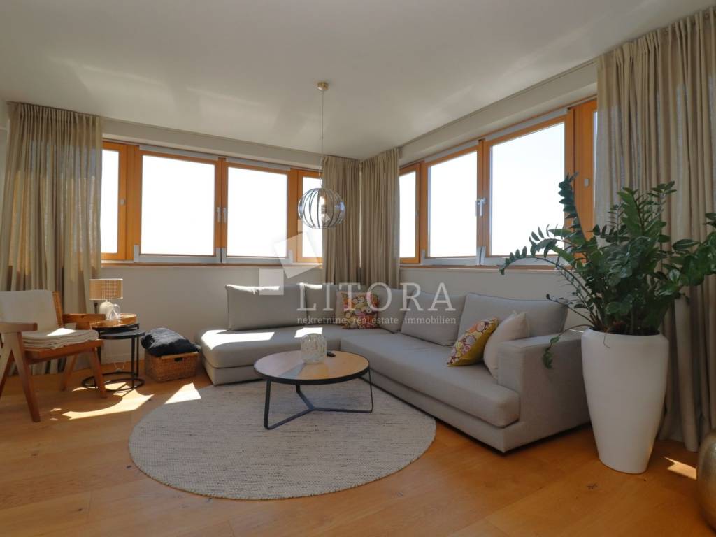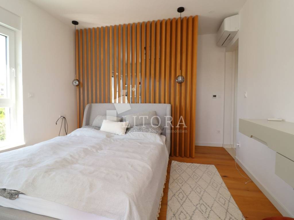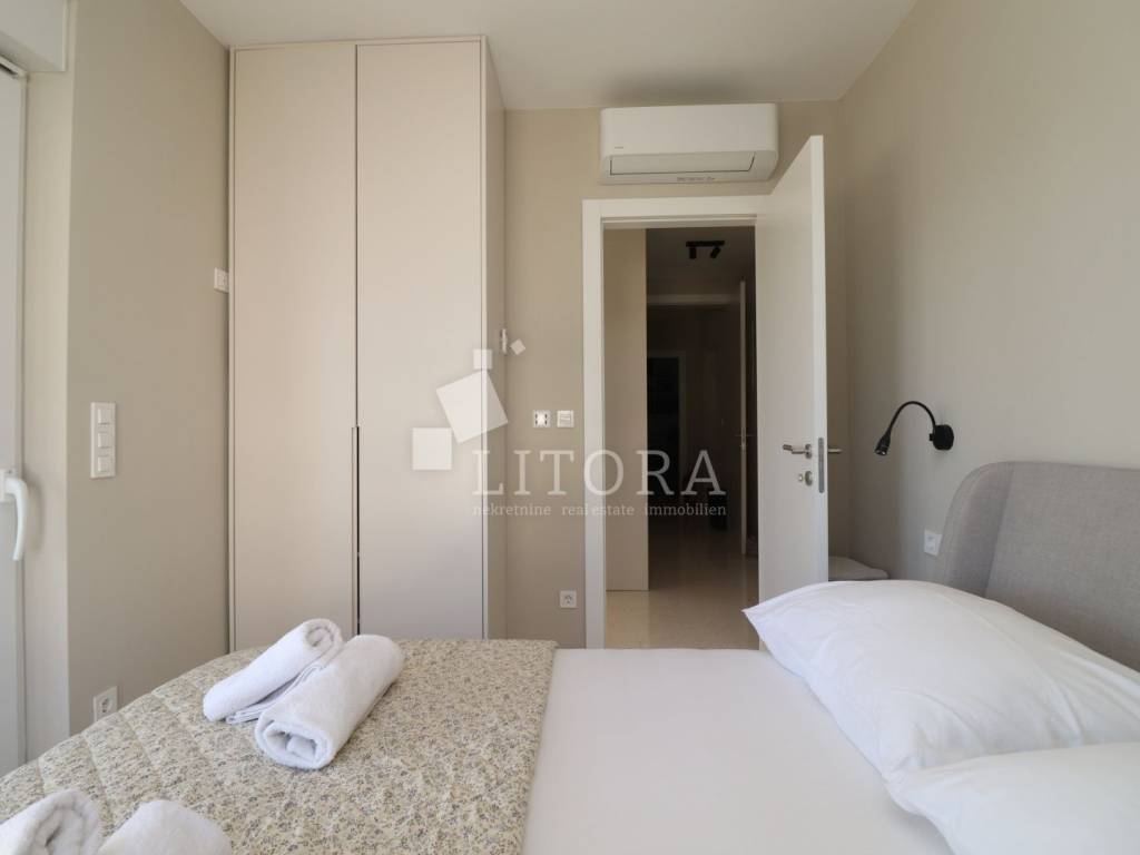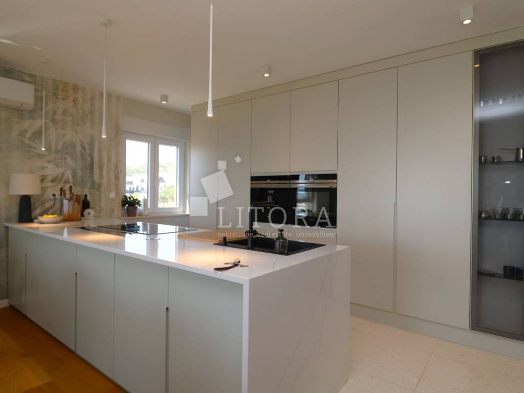A newly built residential building with a total of four housing units, a spacious basement area and a garage space for several vehicles. The property consists of four levels: basement, ground floor, first floor and second floor with total of 477m2 usable area. The building is newly constructed with top-quality materials, situated on a plot of 629 m². In the courtyard there is a 60 m² swimming pool with counter-current swimming and heating option, an outdoor shower, barbecue, and a spacious parking area. The garden is landscaped and enriched with Mediterranean plants and trees. In the basement there is a recreation area, garage space for three vehicles, a boiler room and three storage rooms. On the ground floor there are two separate two-bedroom apartments, each with a large loggia. The first floor features a comfortable three-bedroom apartment with two terraces and sea views, while the second floor offers a spacious two-bedroom apartment with a large terrace providing panoramic views of the sea and the town of Vodice. The building is fully furnished with high-quality, custom-made furniture. It is equipped with underfloor heating throughout, high-quality ceramic flooring, parts of the facade are clad in natural stone, and the aluminum joinery with triple glazing includes shutters, insect screens and electric shutter lifts. The property also has space and predisposition for the installation of an elevator.