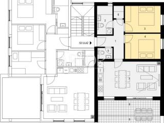 Apartment S1 is located on the 1st floor and consists of: hallway, bathroom, bedroom 1, bedroom 2, toilet, pantry, kitchen/dining room/living room, loggia, covered terrace, parking space 1, parking space 2