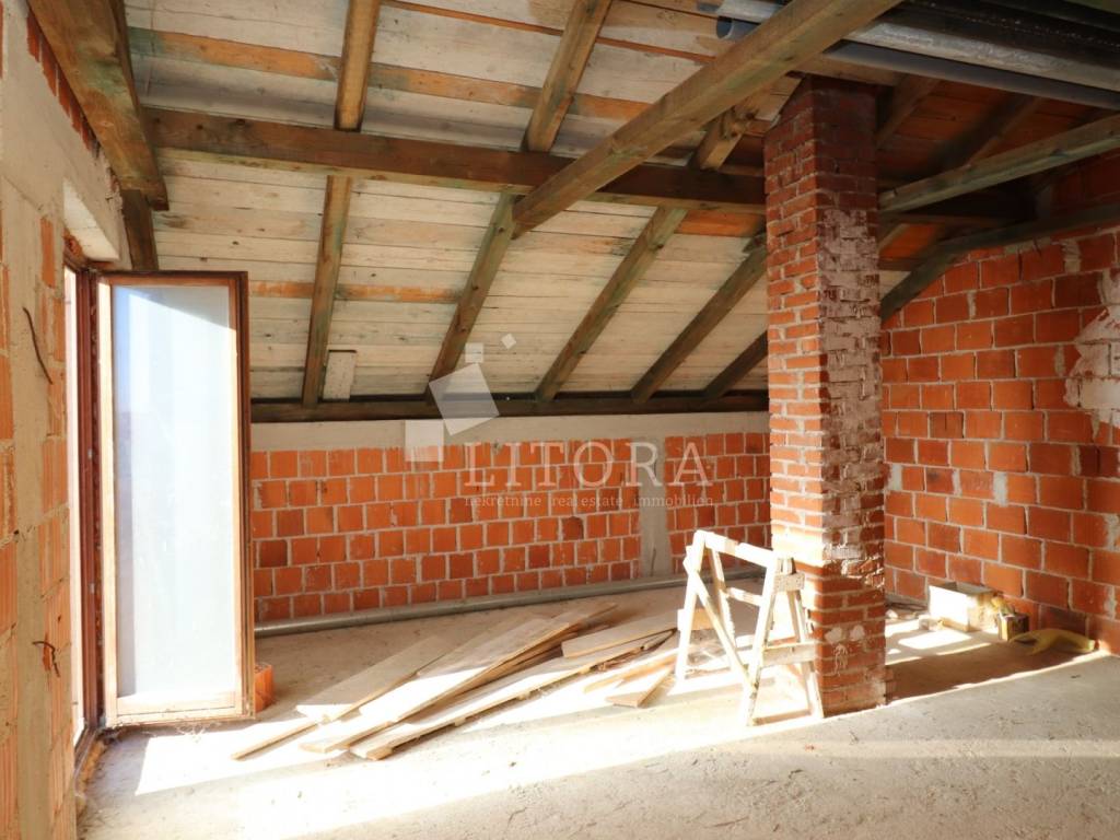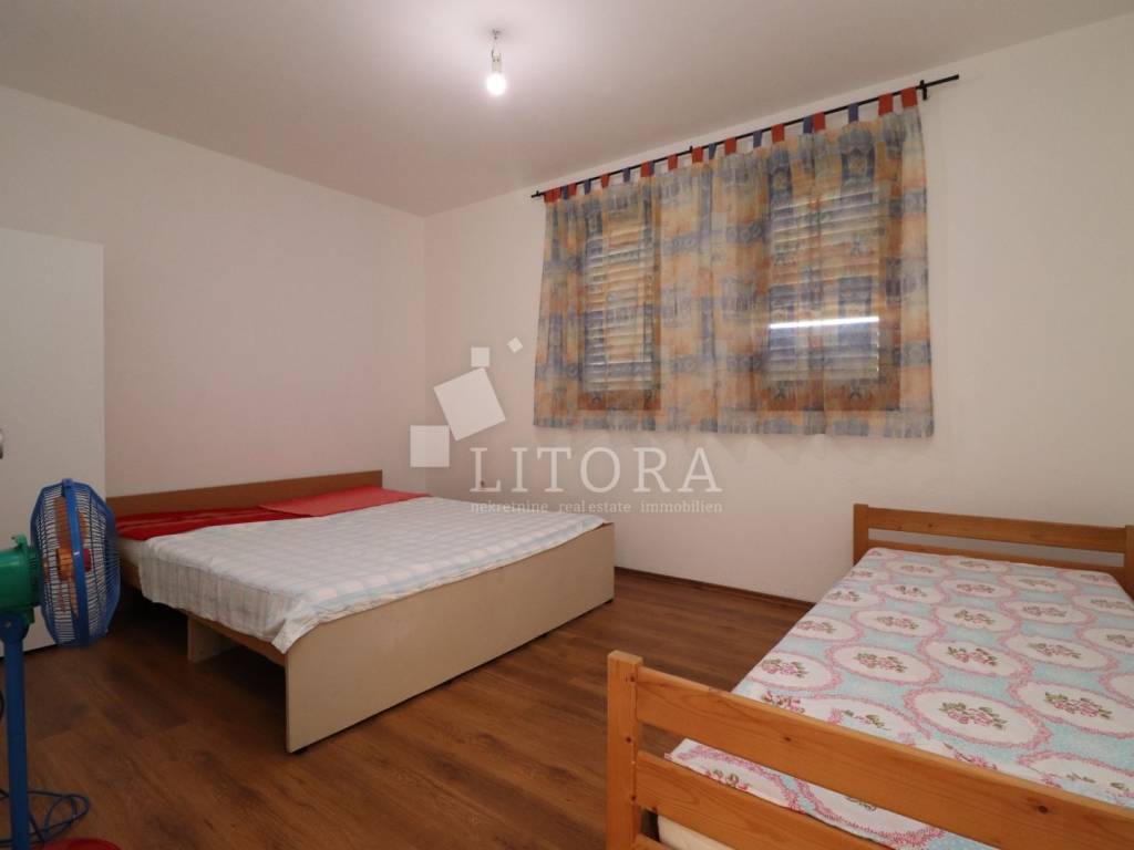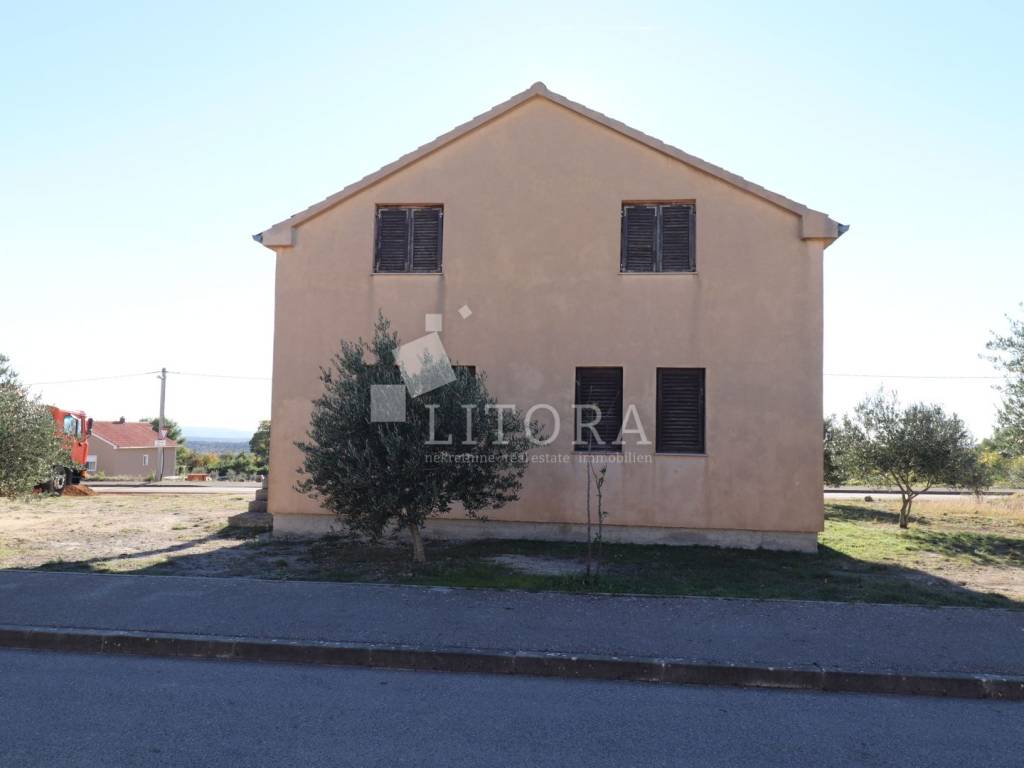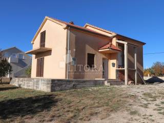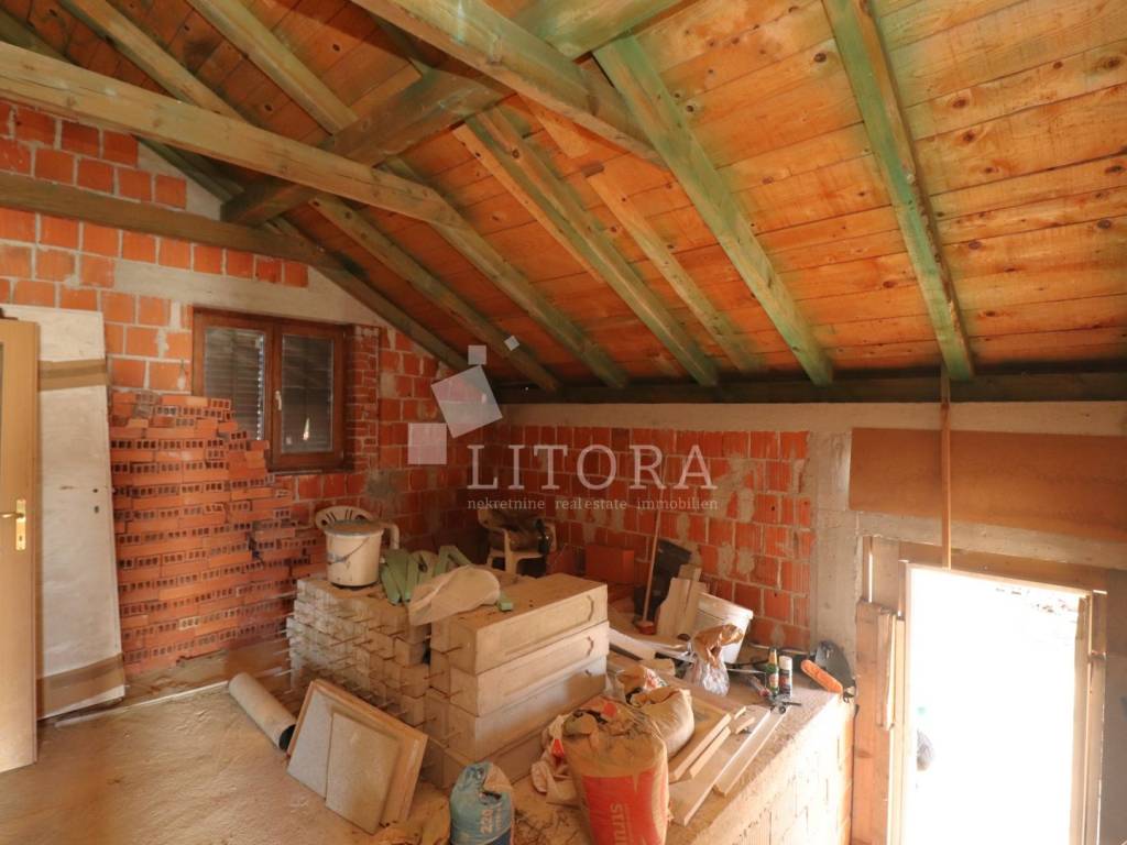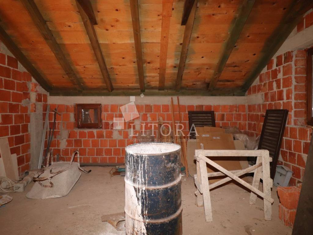 In a quiet part of Benkovac, situated on a gentle elevation with a stunning view of the countryside and the town, lies this detached family house spread over two floors, with a total living area of 146 m², set on a spacious plot of 750 m². The yard extends between two access roads, providing easy entry and additional privacy. On the ground floor there is a fully furnished and move-in ready apartment consisting of: an entrance hall, storage room, bathroom, two bedrooms, a living room with dining area and kitchen, and access to a terrace facing south and east. The apartment is fully equipped, including a wood-burning stove, and is ready for immediate occupancy. The house features a built-in chimney, allowing for solid-fuel heating in the attic as well, should it be converted into a separate unit. The high attic can be arranged as a two-bedroom apartment. It is currently in the shell construction stage, with installed exterior joinery, and has a separate outdoor entrance via an external staircase. The property is connected to public utilities – water supply, sewage, and electricity. The well-maintained garden with several olive trees offers enough space for the construction of a garage, swimming pool, barbecue area, or other outdoor amenities according to the new owner’s preferences. The distance to the town center of Benkovac is approximately 2.5 km, and nearby there is a children’s playground, a small grocery shop, and a primary school. Its peaceful setting, good accessibility, and natural surroundings make this property an ideal choice for family living or a quiet holiday retreat.