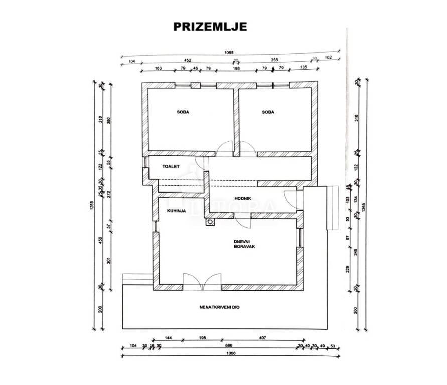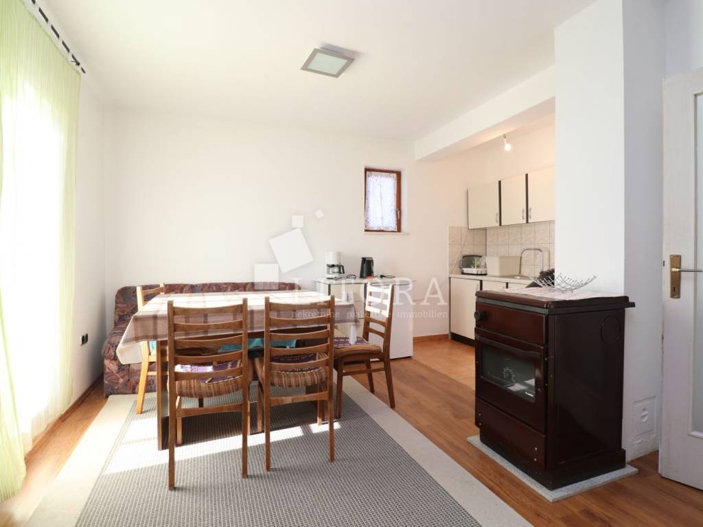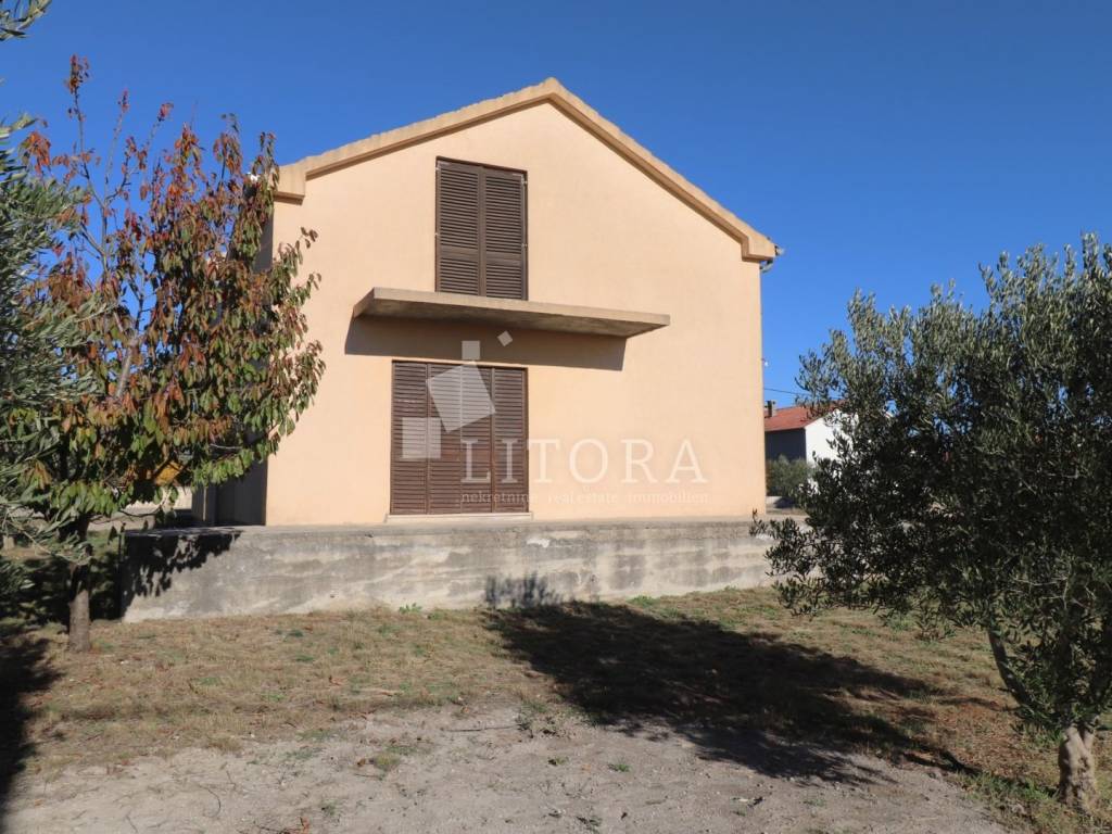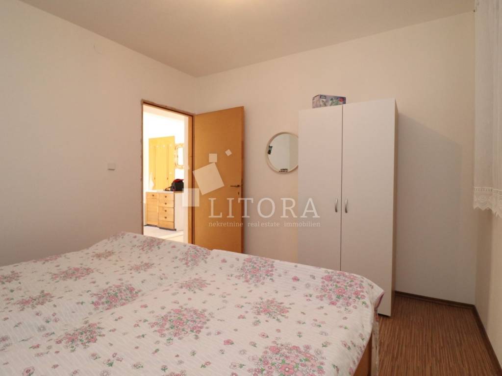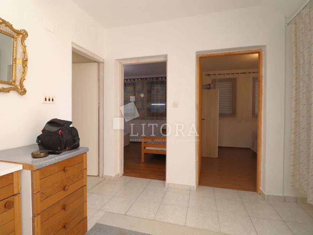 In a quiet part of Benkovac, situated on a gentle elevation with a stunning view of the countryside and the town, lies this detached family house spread over two floors, with a total living area of 146 m², set on a spacious plot of 750 m². The yard extends between two access roads, providing easy entry and additional privacy. On the ground floor there is a fully furnished and move-in ready apartment consisting of: an entrance hall, storage room, bathroom, two bedrooms, a living room with dining area and kitchen, and access to a terrace facing south and east. The apartment is fully equipped, including a wood-burning stove, and is ready for immediate occupancy. The house features a built-in chimney, allowing for solid-fuel heating in the attic as well, should it be converted into a separate unit. The high attic can be arranged as a two-bedroom apartment. It is currently in the shell construction stage, with installed exterior joinery, and has a separate outdoor entrance via an external staircase. The property is connected to public utilities – water supply, sewage, and electricity. The well-maintained garden with several olive trees offers enough space for the construction of a garage, swimming pool, barbecue area, or other outdoor amenities according to the new owner’s preferences. The distance to the town center of Benkovac is approximately 2.5 km, and nearby there is a children’s playground, a small grocery shop, and a primary school. Its peaceful setting, good accessibility, and natural surroundings make this property an ideal choice for family living or a quiet holiday retreat.