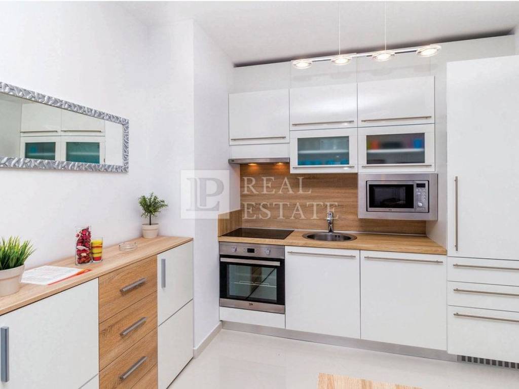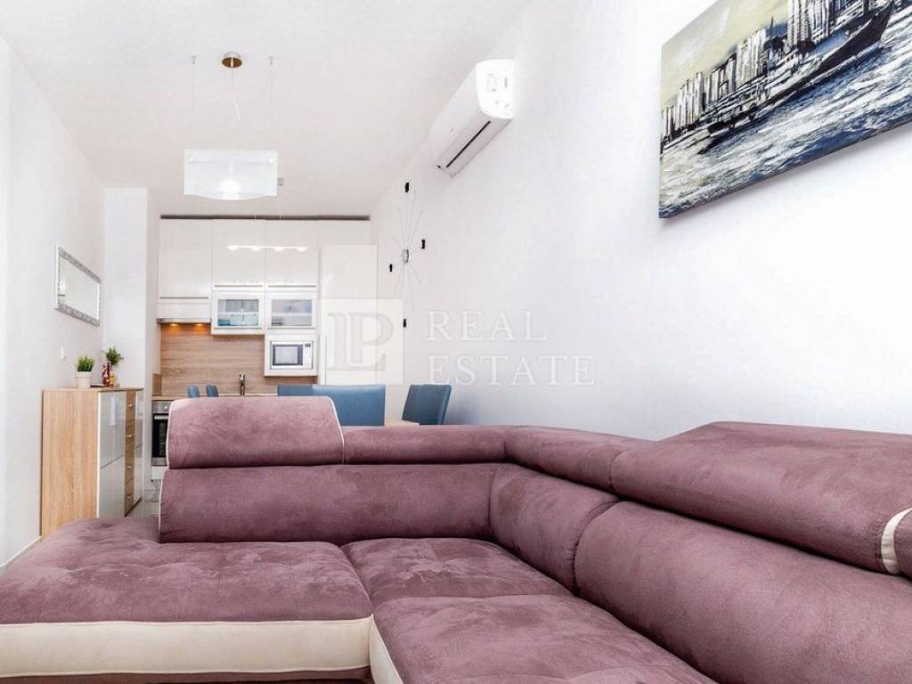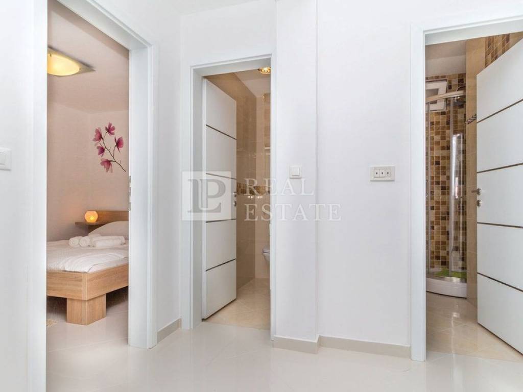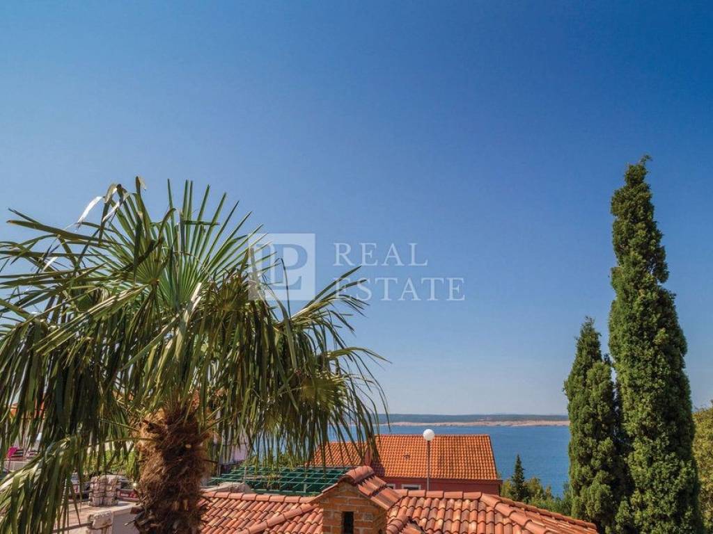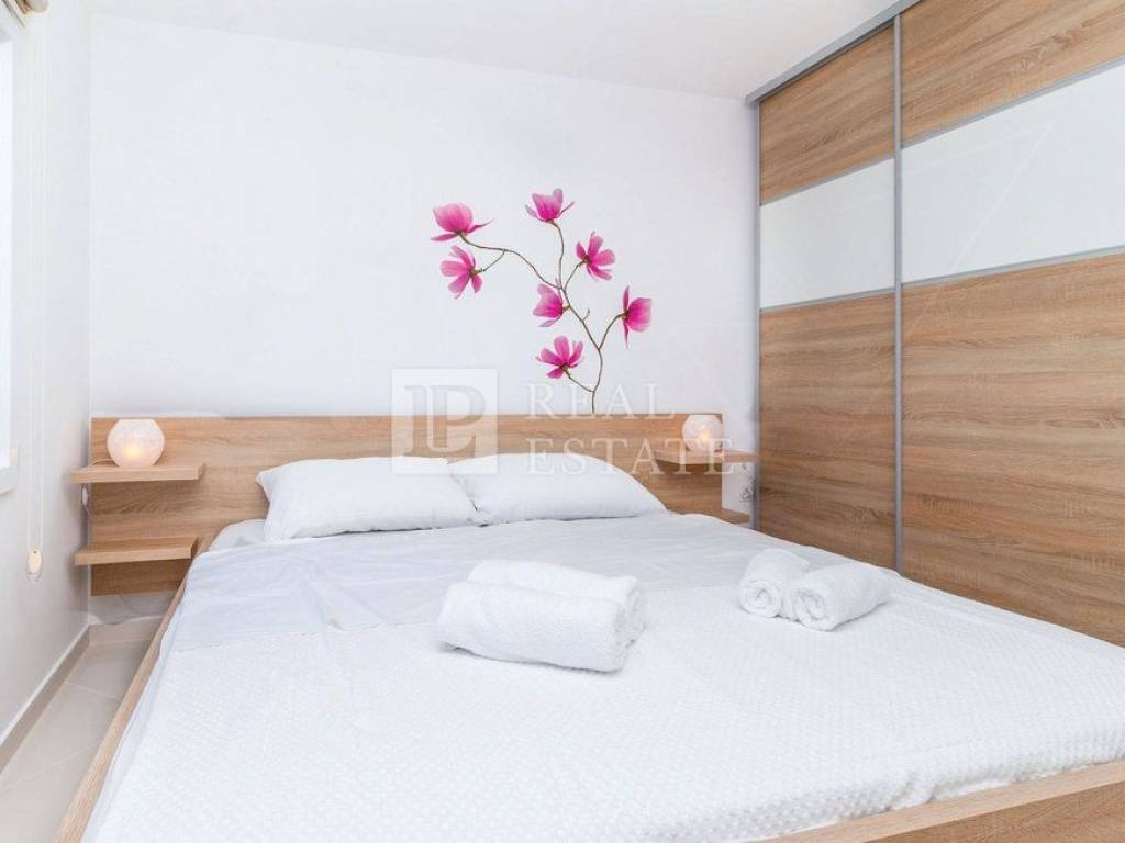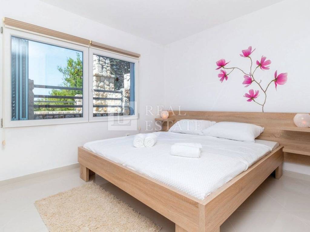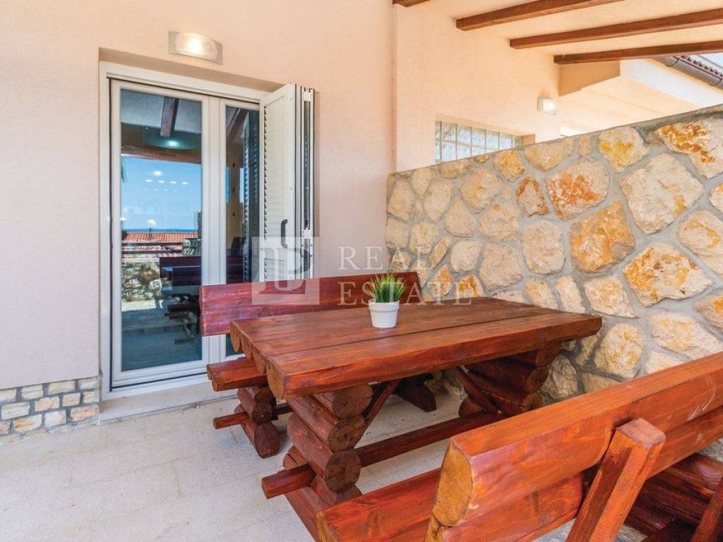The apartment is located on the ground floor of a smaller residential building, and consists of a kitchen with a dining room, a living room, two bedrooms, a bathroom, a toilet and a spacious terrace with a view of the sea. The terrace is completely fenced, which provides privacy, and it is partially covered and there is a stone barbecue on it.