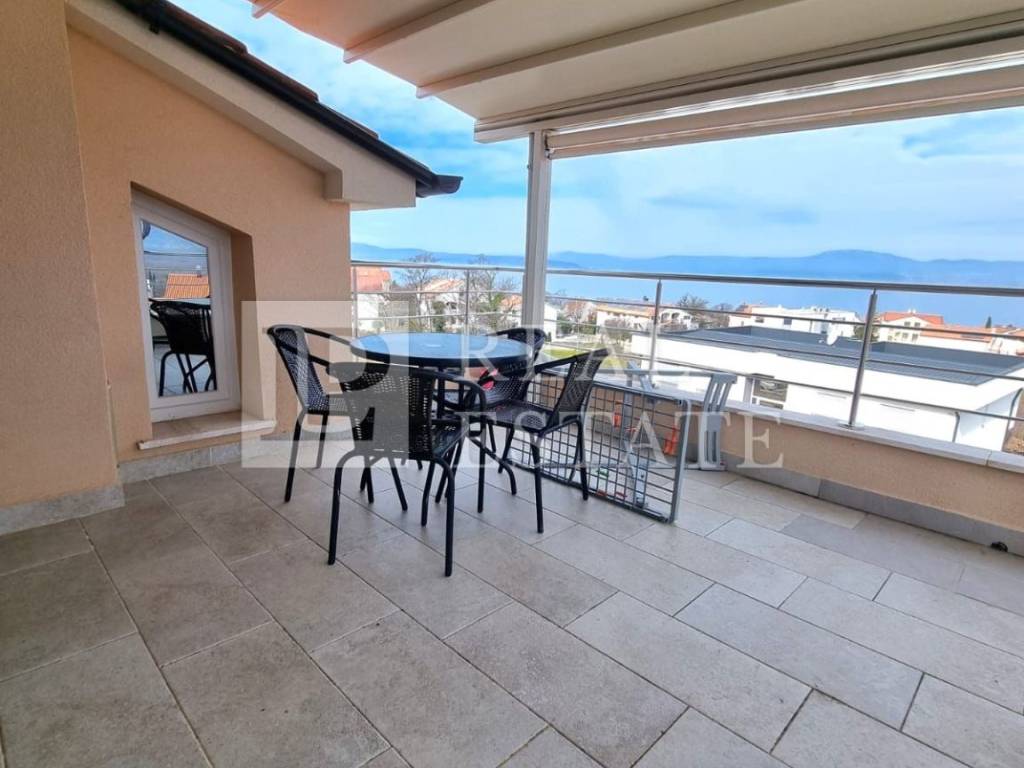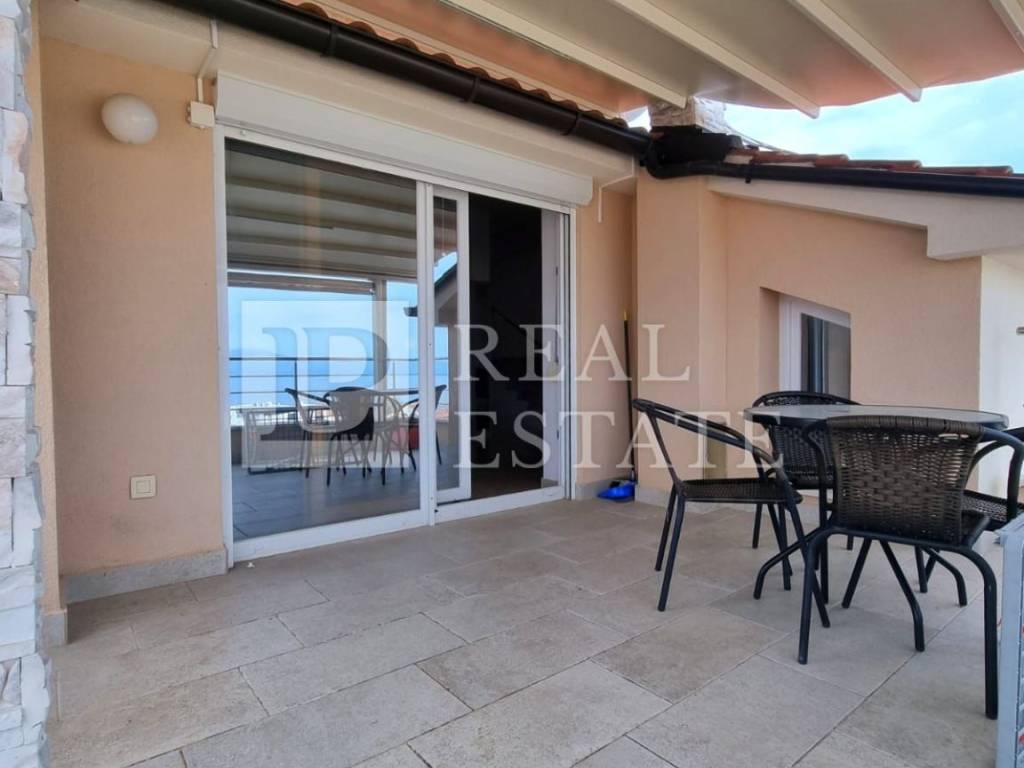 The living room leads to a spacious terrace with a panoramic view of the sea. The apartment also has a yard of 28 m2 on the ground floor of the building.