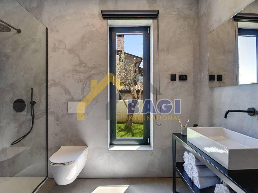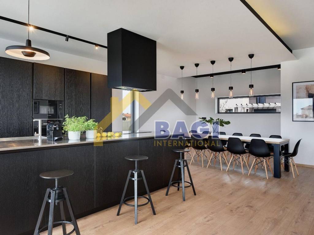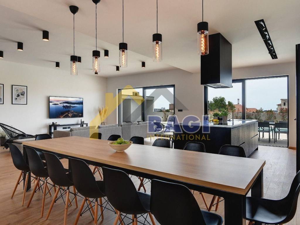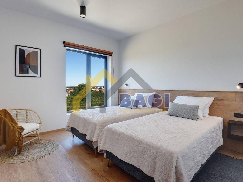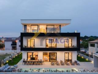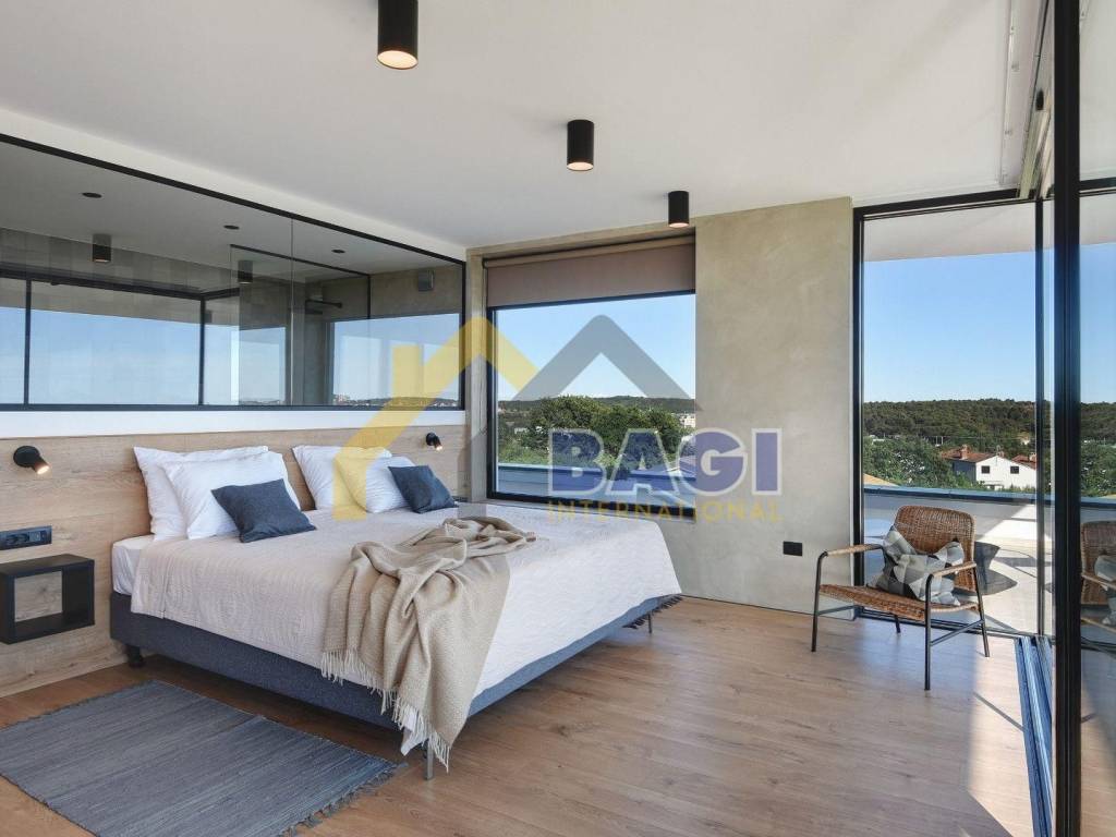 The ground floor consists of a modern kitchen, spacious living room with dining area and dining table for 14 people, one bedroom with bathroom and toilet. On the first floor there are four bedrooms, each with its own bathroom, and a separate room with washing machine and dryer. On the second floor there are two more modern bedrooms, also each with its own bathroom and a beautiful view of the Bay of Pula.