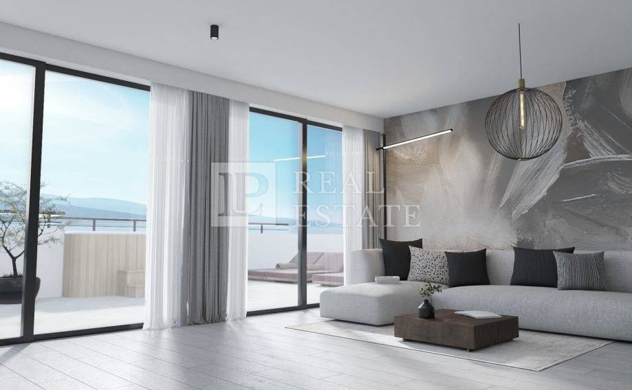 This beautiful two-room apartment is located on the 2nd floor and consists of a hallway, kitchen with dining room, living room, two bedrooms, two bathrooms and a terrace. The apartment offers a panoramic view of the sea and the Kvarner Bay.
