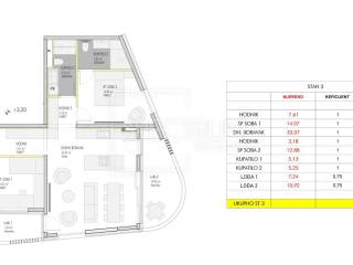 The apartment is located on the 1st floor of a newly built residential building. The area of the apartment is 94.81 m2. The apartment consists of an open space living room with kitchen and dining room, 2 bedrooms, 2 bathrooms, hallway and 2 loggias. One loggia is accessed from the living room, and the other is accessed from the bedroom and the living room. The apartment offers a view of nature. The apartment is heated by underfloor heating with a heat pump and air conditioning. The apartment is built with high-quality materials, such as floors, sanitary ware, ALU carpentry, security doors. The building also has an elevator and surveillance cameras. The apartment also has a parking space with an electric connection for charging electric vehicles.