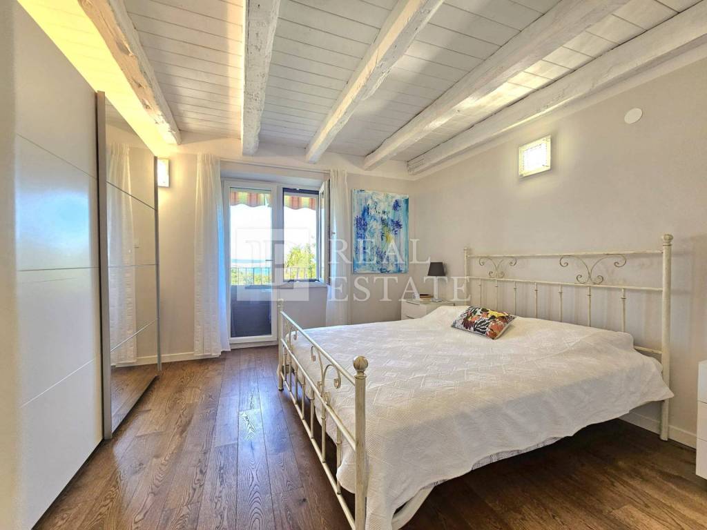 An internal staircase leads to the second floor where there is a stylishly decorated entrance hall/hallway with chairs and a coffee table and as many as three bedrooms, two of which have their own bathroom. The rooms are modernly furnished and decorated, and two of the rooms (south-facing) have direct access to another spacious terrace with an open view of the sea.