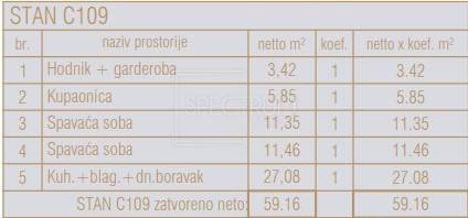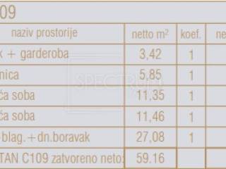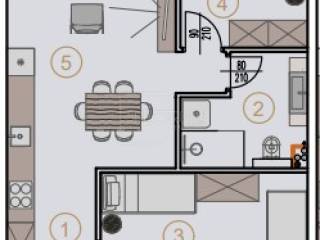 The apartment is located on the 1st floor of a newly built residential and commercial complex consisting of central, southern and northern parts. The area of the apartment is 59.16 m2. The apartment consists of a living room with a kitchen and a dining room, 2 bedrooms, a bathroom and a hallway. The apartment is sold on a "turnkey" basis with a fully equipped bathroom (furniture and sanitary ware), floor coverings in all rooms (class 1 ceramic, laminate), installed electrical installations, built-in air conditioning, interior carpentry, exterior PVC or ALU carpentry, burglar-proof and fire-proof entrance doors, antenna system, UTP network, and white walls and ceilings.