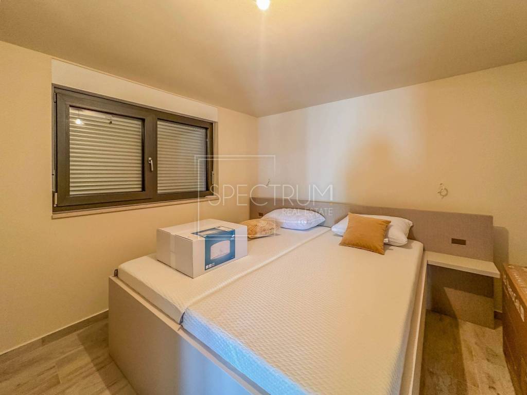 The apartment is located on the 2nd floor of a newly built residential building. The net area of the apartment is 52.65 m2. The apartment consists of an open space living room with kitchen and dining room, 2 bedrooms, bathroom, hallway and terrace with a sea view. The apartment is heated by air conditioning and underfloor heating in the bathroom. Quality materials were used in the construction, rock wool insulation, security doors, aluminum windows with electric shutters and mosquito nets. The apartment is sold furnished.