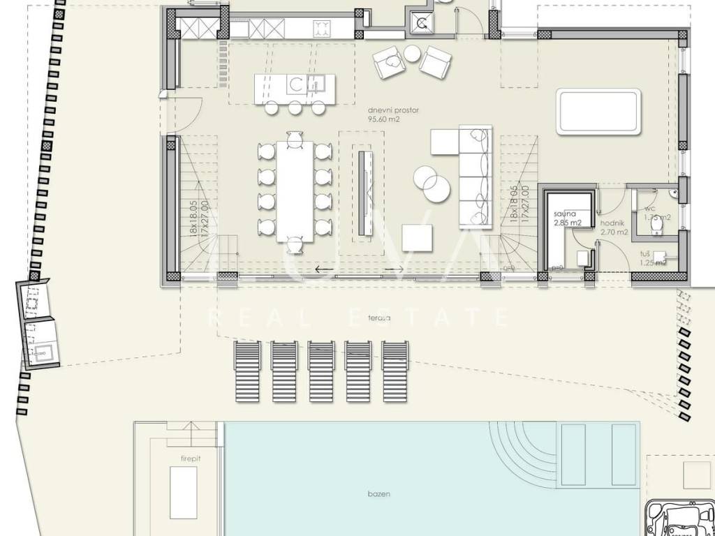 The infinity pool with a transparent glass wall creates the impression of an endless connection with the sky and the distant sea. Next to the pool, on the same level, there is a fire pit, which in the evening hours provides a play of light reflected on the glass surfaces of the pool.