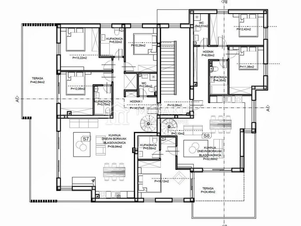 APARTMENT S7 is located on the second floor and consists of three bedrooms, hallway, staircase, toilet, two bathrooms, living room, dining room and kitchen.