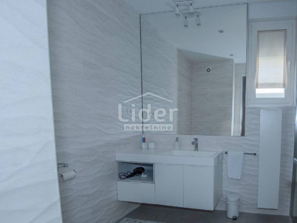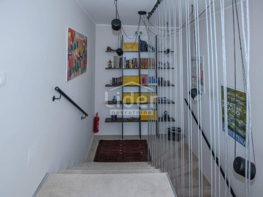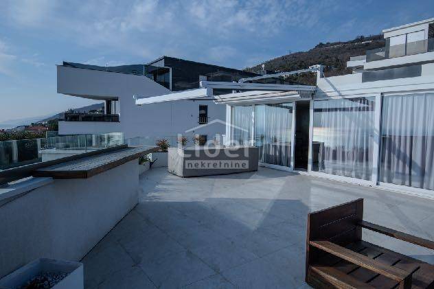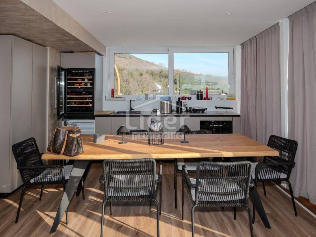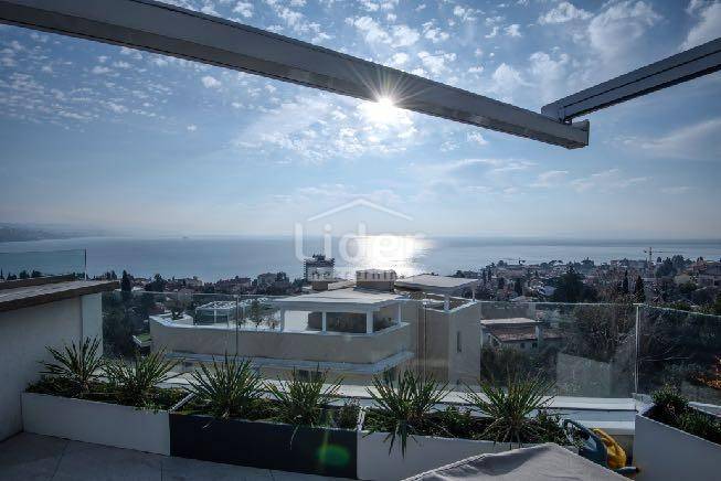 Exclusive penthouse in Opatija for sale. An impressive 267 m2 on the second floor of the villa and a roof terrace with a hot tub and views of the entire Kvarner Bay. The interior will satisfy even the most demanding buyer, as the layout and functionality are excellent. The open space, which includes the living room, dining room, and kitchen, as well as a beautiful terrace with a view, is just part of this beautiful apartment. There are also three bedrooms with three bathrooms, two dressing rooms, and a storage room. Access by elevator or stairs leads to the roof terrace, which completes the apartment. There is a large hot tub, a covered kitchen with a table for socializing, and plenty of space for sunbathing and relaxing. The view extends to the Kvarner Bay and to the north to Mount Učka. There are three parking spaces in the garage and one outside. The furniture is included in the price.