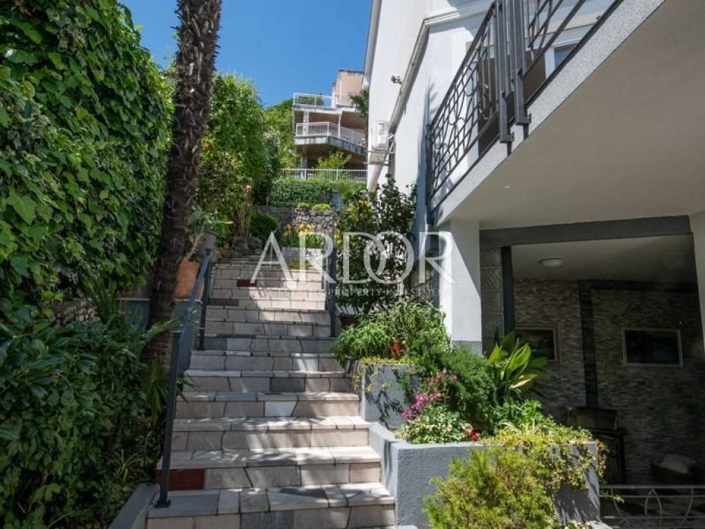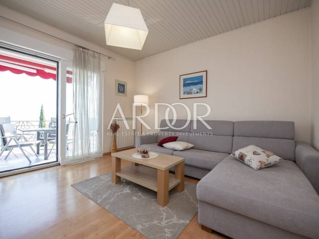 A nice apartment for sale, located on the first floor of a family house, with a separate entrance. It consists of three bedrooms, two of which are larger rooms, and one smaller living room, three bathrooms with showers, a large kitchen, a pantry, and two balconies and a veranda. One balcony is located at the exit from the living room with a magnificent view of the sea, the other is located on the southern side of the kitchen, while the northern exit from the kitchen leads to a covered veranda. The apartment is equipped with air conditioners in the living room and bedroom, it is furnished with all the necessary appliances, and parking is provided.