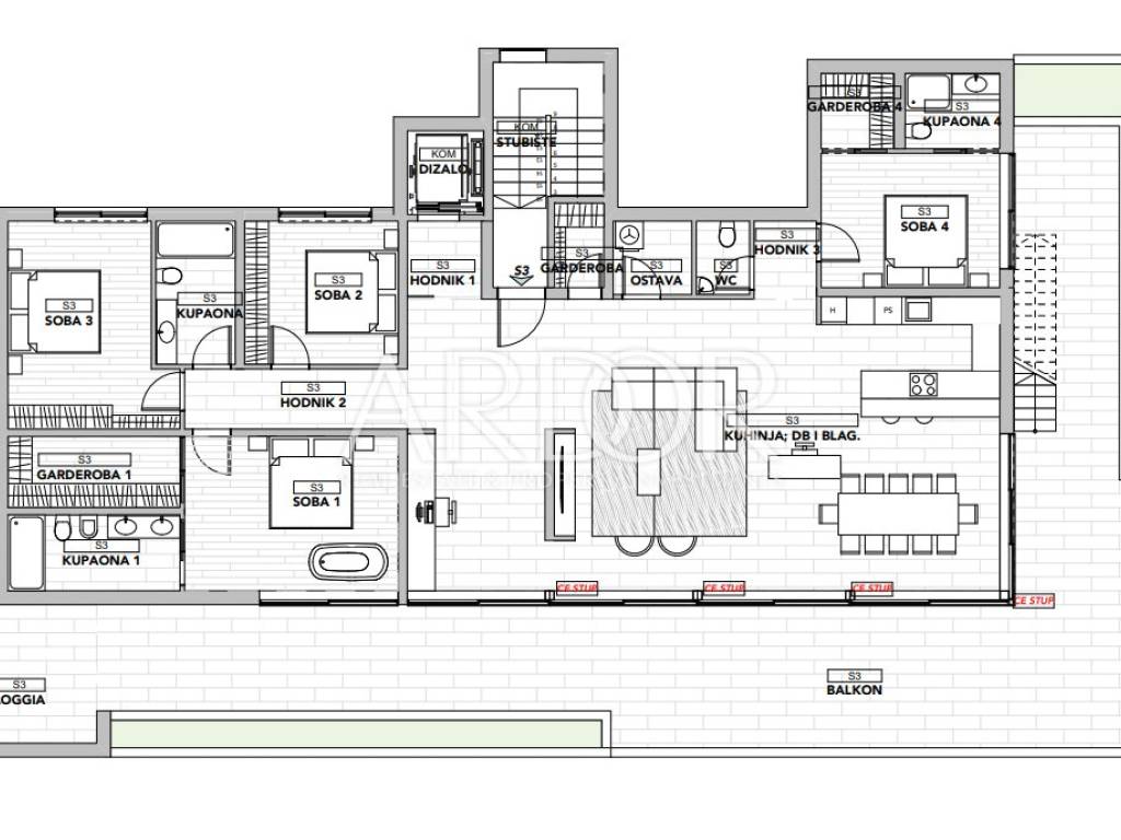 The apartment also has three garage spaces of 15 m2. Each apartment will be equipped with a modern cooling system, quality ceramics, lighting and carpentry. Recommendation of agents!