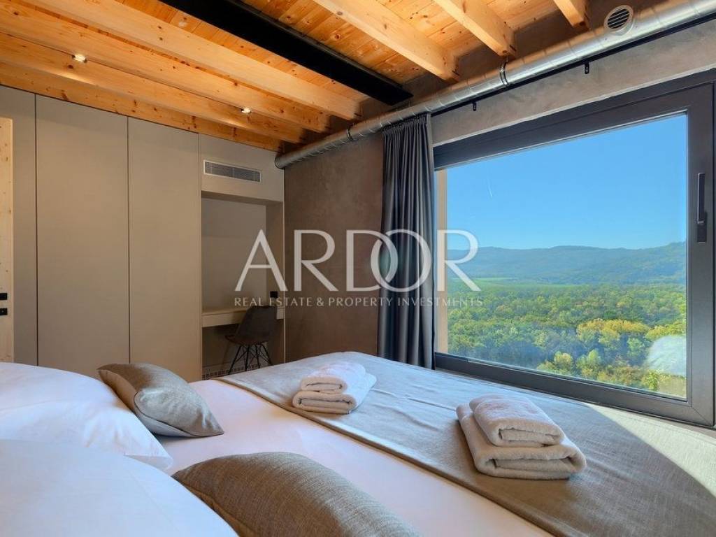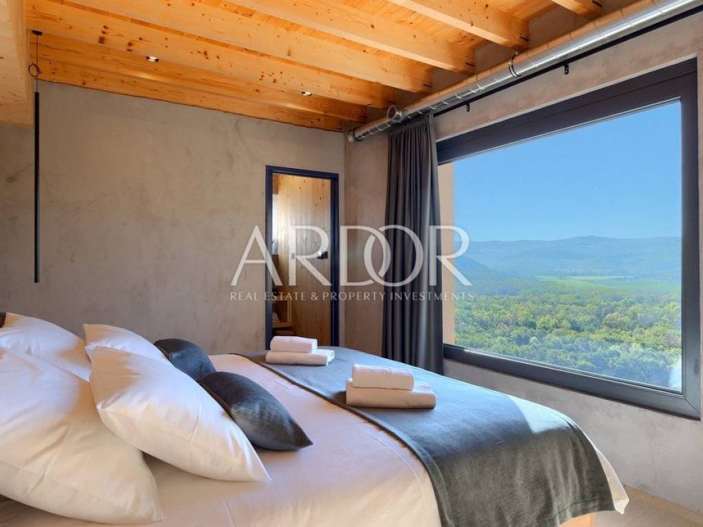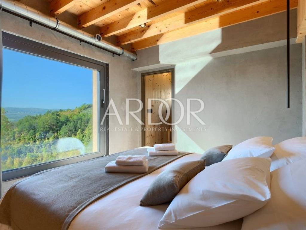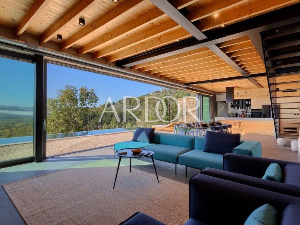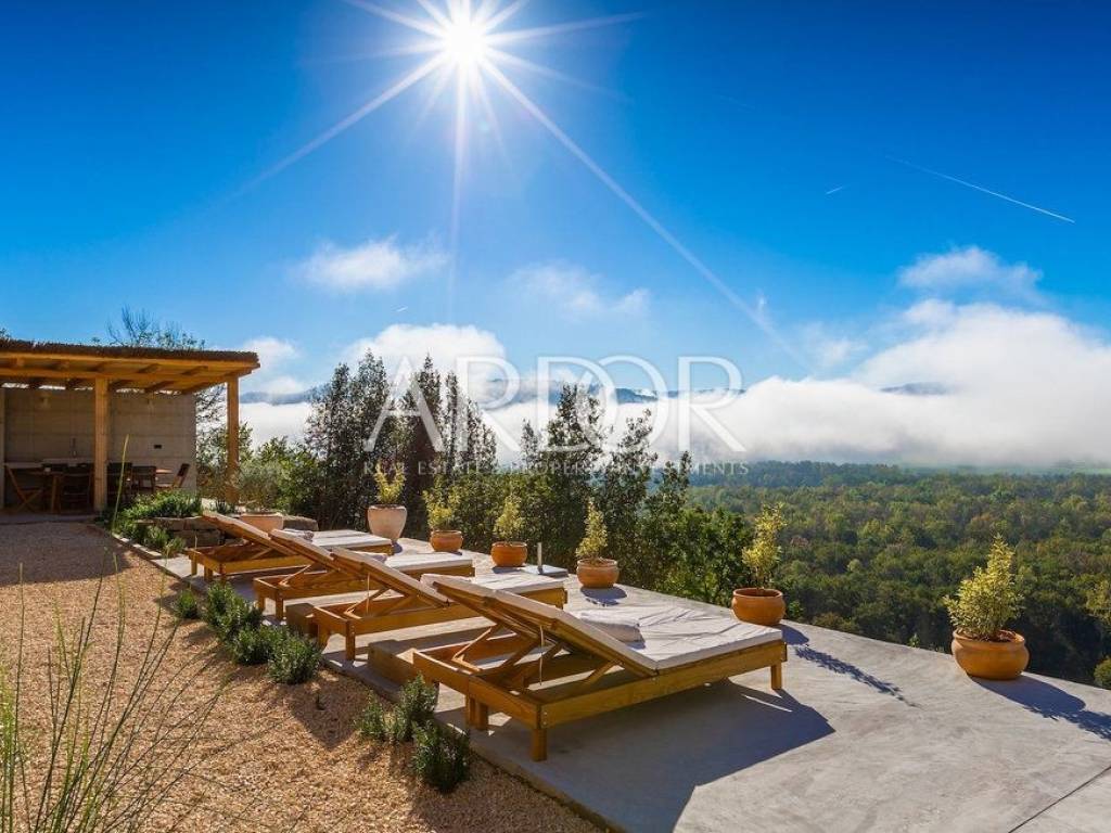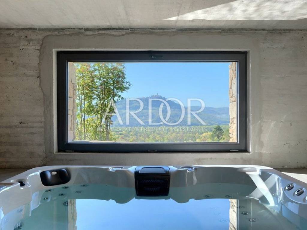Situated on a hill in the heart of Istria, one of the most beautiful destinations, this villa is located in the immediate vicinity of some of the most famous wineries and restaurants. This Istrian region is known for its excellent wines, top-quality virgin olive oil and truffles.