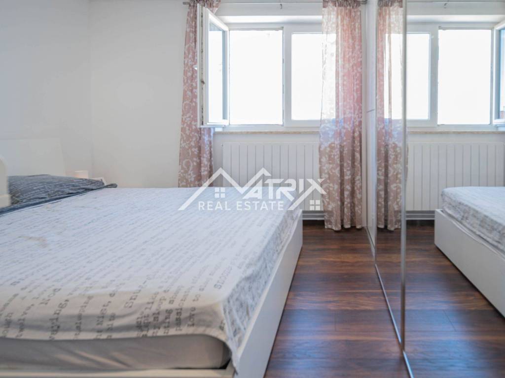 The property has been recently renovated, featuring new laminate and tile flooring, as well as a pellet stove for central heating. Two air conditioning units provide additional comfort. The apartment is bright and well-maintained, with a southeast orientation that maximizes natural light.