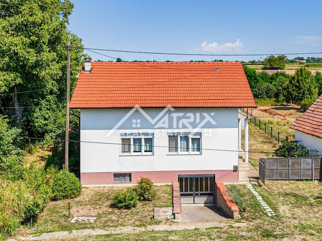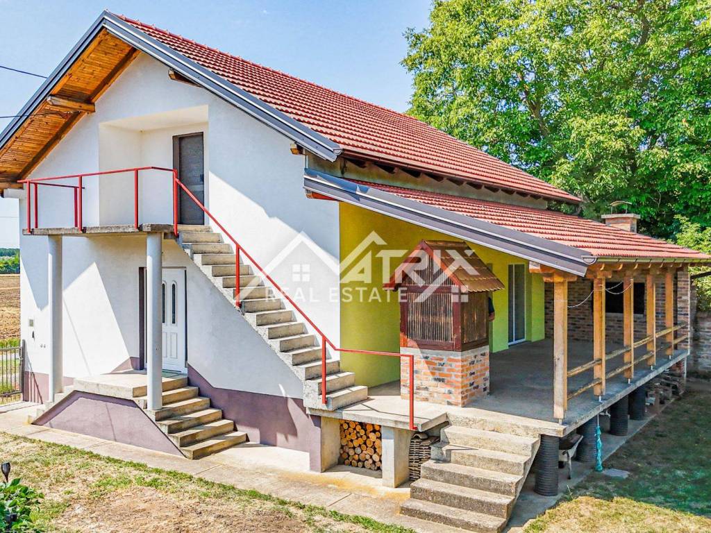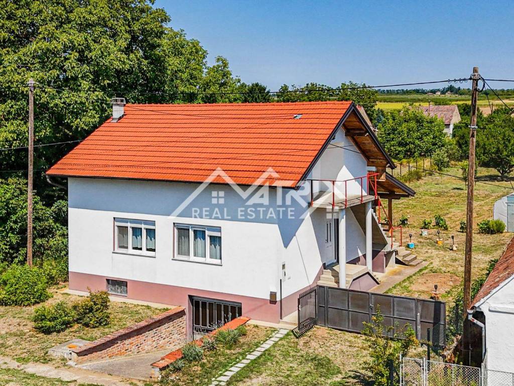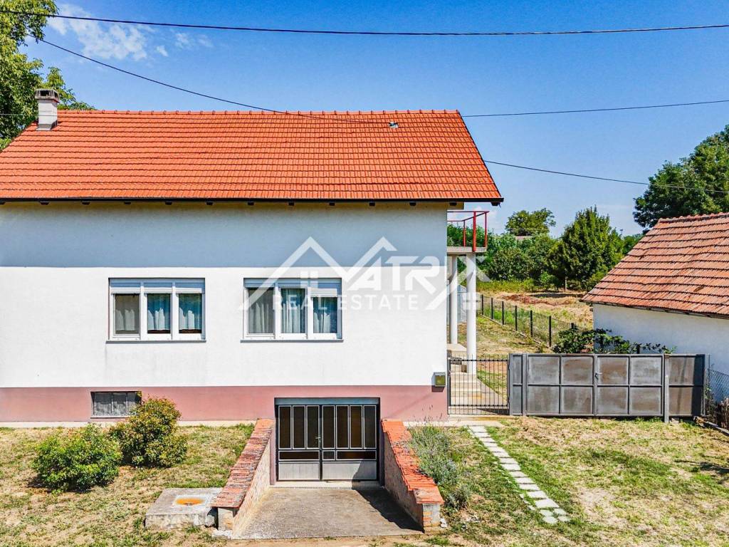 Located on a quiet street in Erdut, about 30 km from both Osijek and Vukovar and close to the Croatia-Serbia border, this raised bungalow offers roughly 120 m² of living space on an approximately 1 237 m² plot. Surrounded by vineyards, cycling routes and the Aljmaš pilgrimage site, it is ideal for rural tourism or a spacious family home. The ground floor features a hallway, large bathroom with walk-in shower, master bedroom, smaller bedroom and an open-plan kitchen-dining-living area that opens to a very spacious covered terrace with a traditional bread oven.