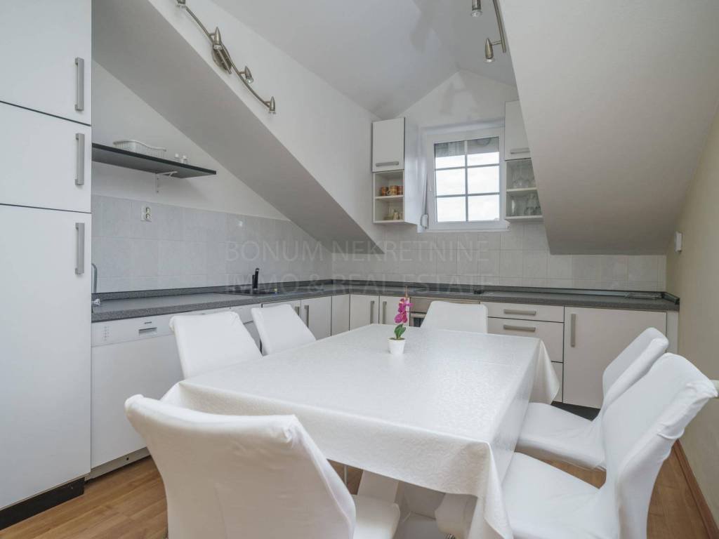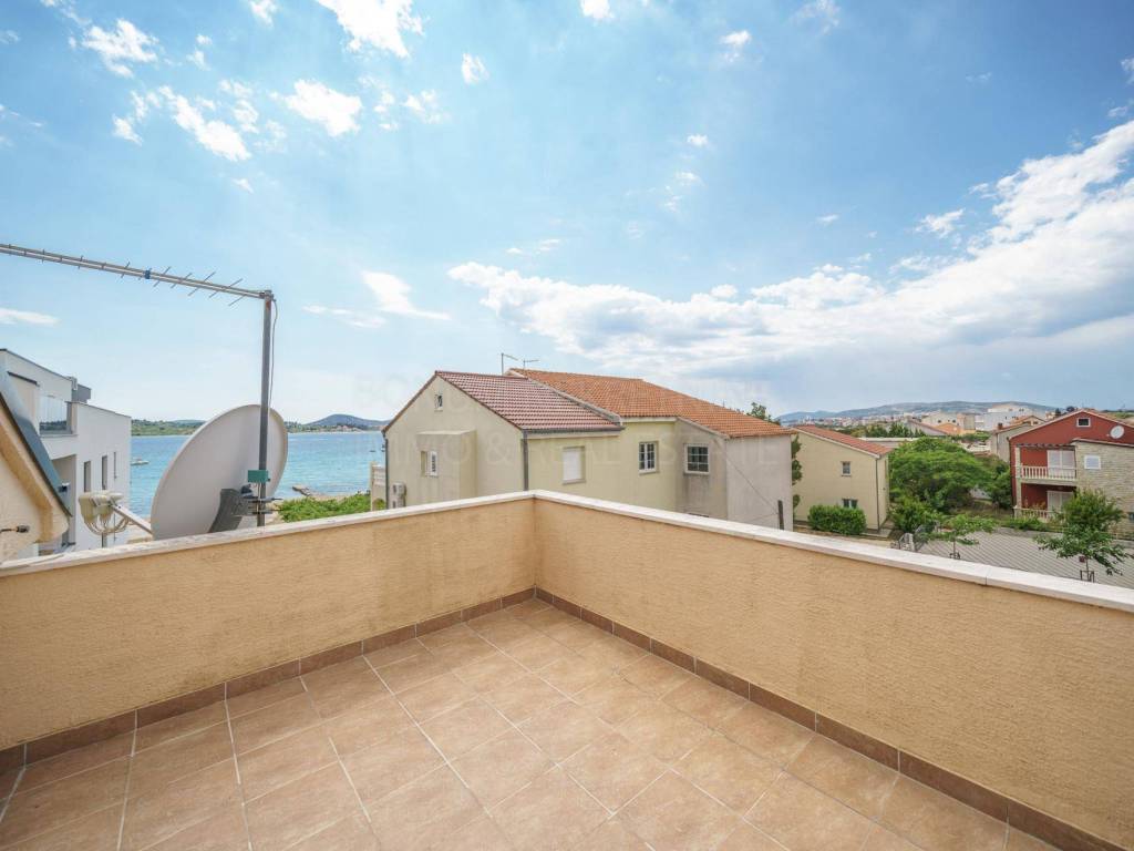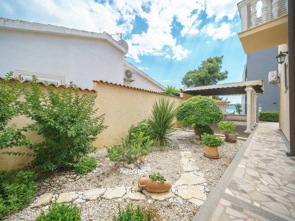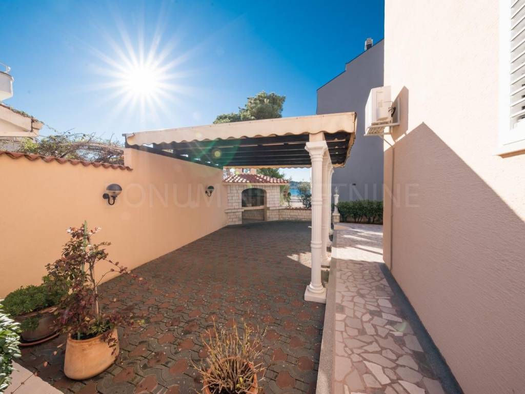 Apartment house for sale near the sea and the beautiful beach on Srima-Vodice. The house is detached, apartment type. It consists of ground floor, first floor and attic. There are three studio apartments on the ground floor. Each has 30 m2. Upstairs there is a spacious apartment of 90 m2 (three bedrooms, bathroom, toilet, kitchen, dining room and living room in one unit and three balconies). In the attic there is another apartment - 68 m2 (bedroom, kitchen, dining room, living room, bathroom, toilet and two terraces with beautiful sea views. The yard is arranged, and there is also a laundry room, garage of 35 m2 , outdoor kitchen and behind the house is a storage room in which the boiler room is located.The house is located in the second row to the sea, only 50 m from the beautiful and well-maintained beach.