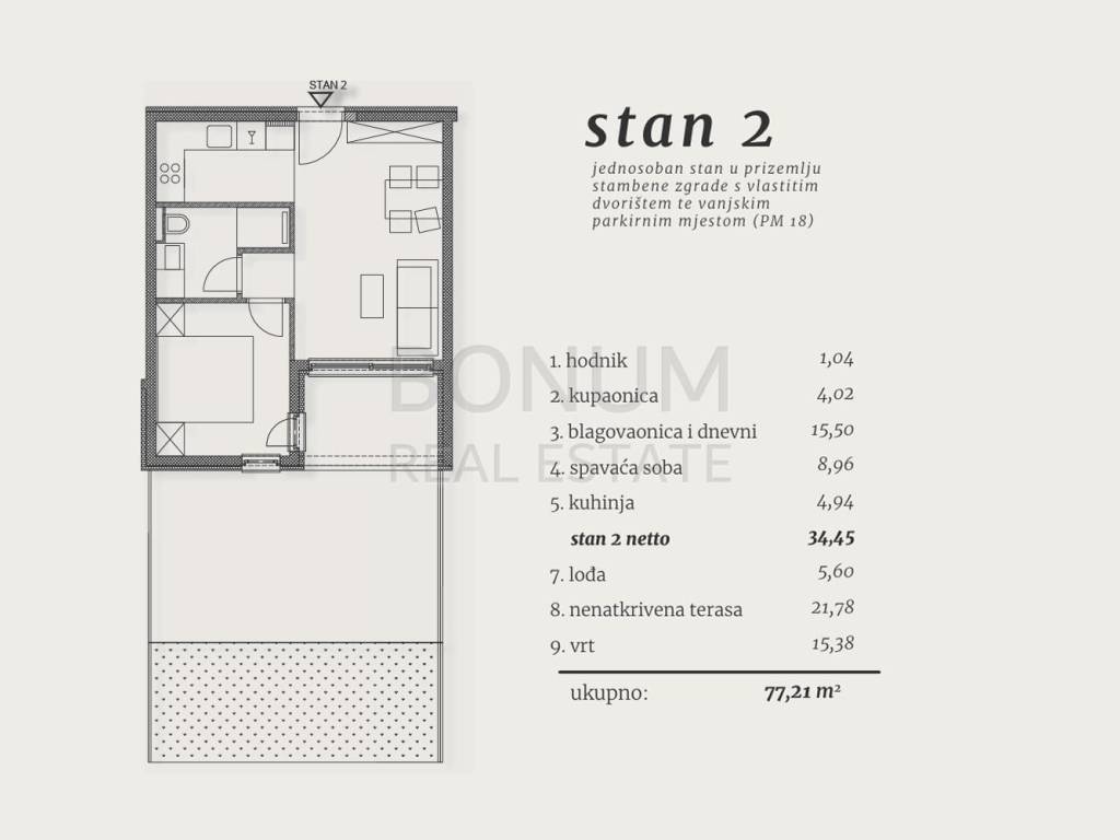 S2 - consists of hallway, kitchen, living room and dining room in one unit, bedroom, storage room (34.45 m2), loggia (5.60 m2), uncovered terrace (21.78 m2), garden of 15.38 m2 and outdoor parking space.