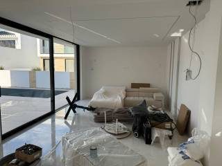 The villa consists of a ground floor and an upper floor. On the ground floor there is a study that can also be used as a bedroom, a laundry room, and a kitchen with a dining room and an open-plan living room. In front of the villa there is a swimming pool with a sunbathing area.