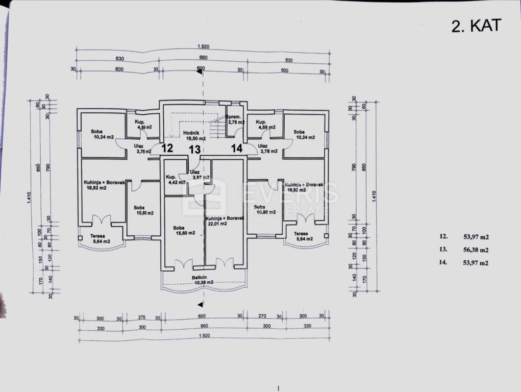 - apartmana br. 14: 53,97 m2 (ulaz, kupaonica, kuhinja + dnevni boravak, dvije spavaće sobe, terasa)