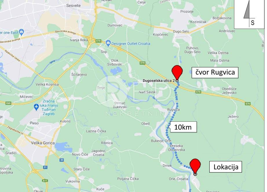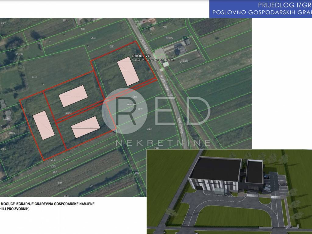 PRILIKA! PRODAJA ZEMLJIŠTA RUGVICA - OBOROVO Prodaje se zemljište u Oborovu (10km od prometnog čvora Rugvica), k.č.br. 935/2 k.o.Oborovo, površine 5.319 m2 mješovite namjene (stambena i poslovna). Uz navedeno zemljište na prodaju je i k.č.br. 935/3 površine 12.539 m2 koje je trenutno poljoprivredne namjene, ali je u tijeku izmjena Plana kojom je predviđena prenamjena u mješovito. Trenutno ova kombinacija namjena pruža idealne uvjete za bavljenje uzgojem kultura te preradom i proizvodnjom bez potrebe transporta sirovine do proizvodnje. Prenamjenom u mješovitu namjenu dobiti će se razne mogućnosti izgradnje poslovno gospodarskog sadržaja. U prilogu oglasa možete pronaći jedan od mogućih scenarija za eksploataciju predmetnih čestica (idejno rješenje izgradnje koje sadrži uvjete iz plana), a to je izgradnja poslovno gospodarske građevine građevinske bruto površine u iznosu od 800m2 (parcelacijom je moguća izgradnja dvije takve građevine). Zemljište k.č.br. 935/3 ima pristupni put sa županijske ceste sa svim komunalnim priključcima. Za predmetnu lokaciju primjenjuju se Odredbe Prostornog plana uređenja Općina Rugvica, a one su sljedeće: Za gradnju građevina gospodarske namjene, u građevinskom području naselja sljedeće su granične vrijednosti: · najmanja površina građevne čestice iznosi 1000 m² · najveći dopušteni koeficijent izgrađenosti iznosi 0,3 (30%) · najveća građevinska (bruto) površina zgrade ne može biti veća od 800m2 · najveća ukupna visina iznosi 11 metara · udaljenosti od granica čestica min. 5,0 m ili h/2 Prodavatelj je ovlašteni arhitekt sa vlastitim uredom za projektiranje, nadzor, građenje i konzalting te je u mogućnosti budućem kupcu osigurati svu potrebnu projektnu dokumentaciju potrebnu za izgradnju poslovne građevine, vršiti konzalting usluge do ishođenja građevinske dozvole, također i kompletan konzalting i vođenje projekta u fazi ugovaranja i samog izvođenja radova. Za sva dodatna pitanja budite slobodni kontaktirati nas.
