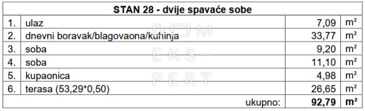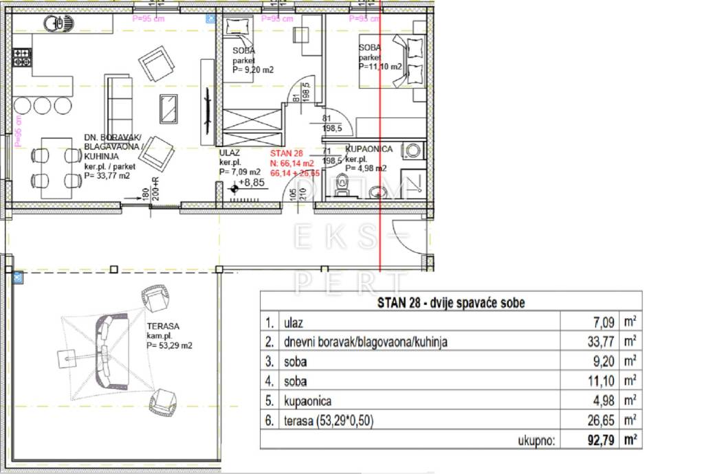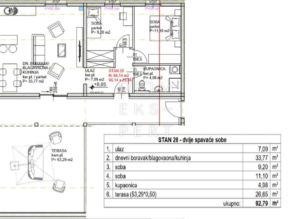 Total area: 92.79 m² including a terrace of 53.29 m², calculated with the applicable coefficient (26.05 m²)
