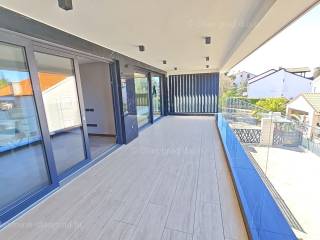 Structurally, this is a spacious one-story apartment that occupies the entire floor of the building. Located on the 2nd floor of a high-quality construction building, the apartment is one of only three residential units. The total area covered by the apartment is approximately 120 m². It consists of an entrance area, a toilet, a bathroom, three bedrooms, with the master bedroom having its own bathroom, a spacious living room with a kitchen and dining area, and access to a covered terrace. The interior of the property is fully equipped with the latest designer furniture, Mitsubishi air conditioning, underfloor heating, lift-and-slide joinery, porcelain ceramics, Diere anti-theft doors, walnut wood room doors, and an exterior façade made of Roman Travertine stone.