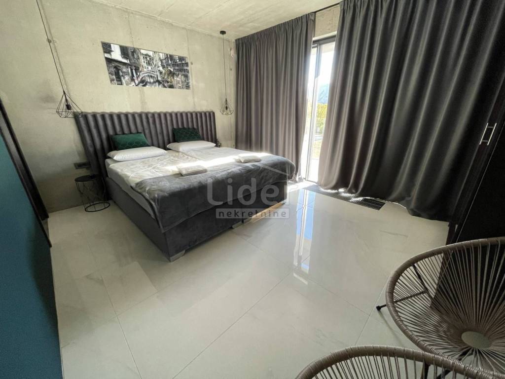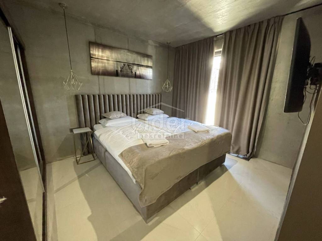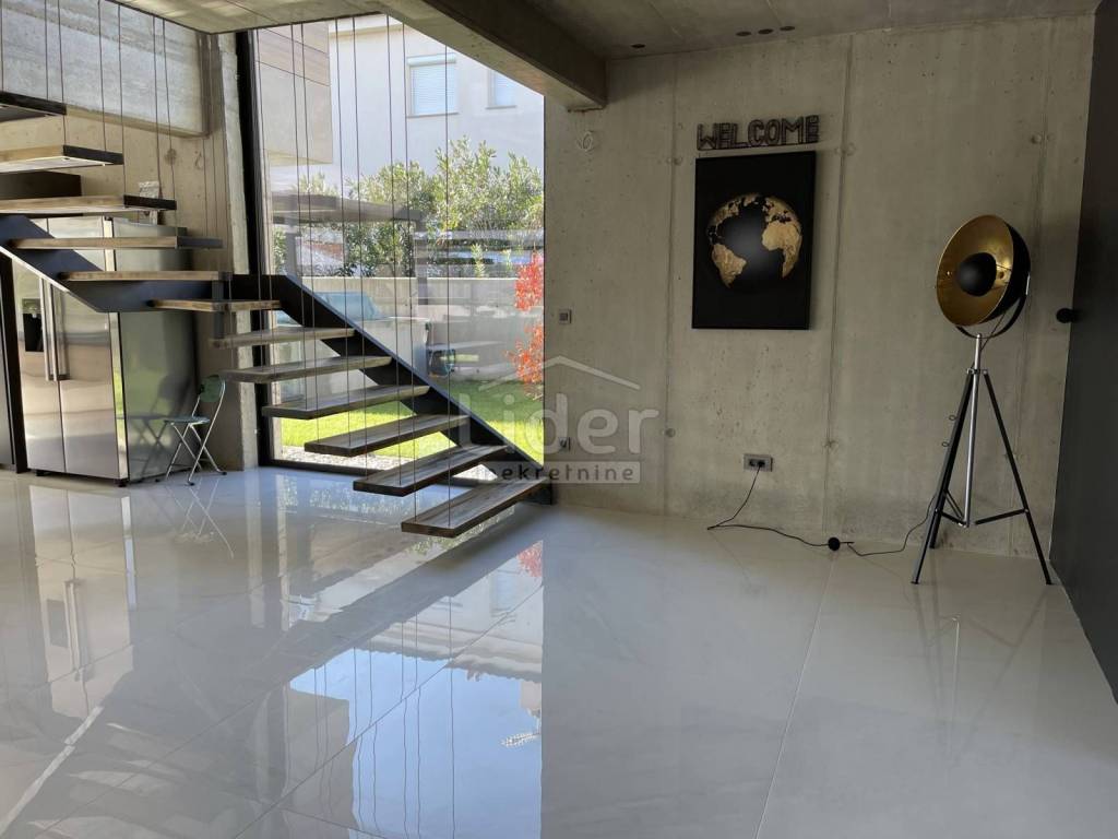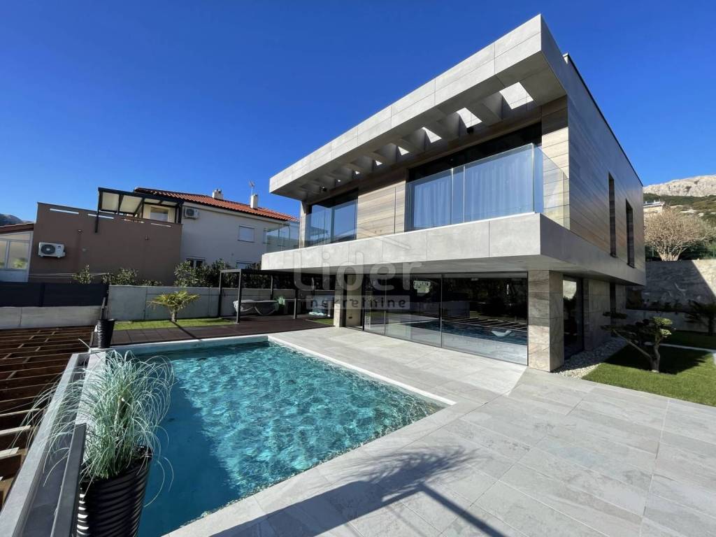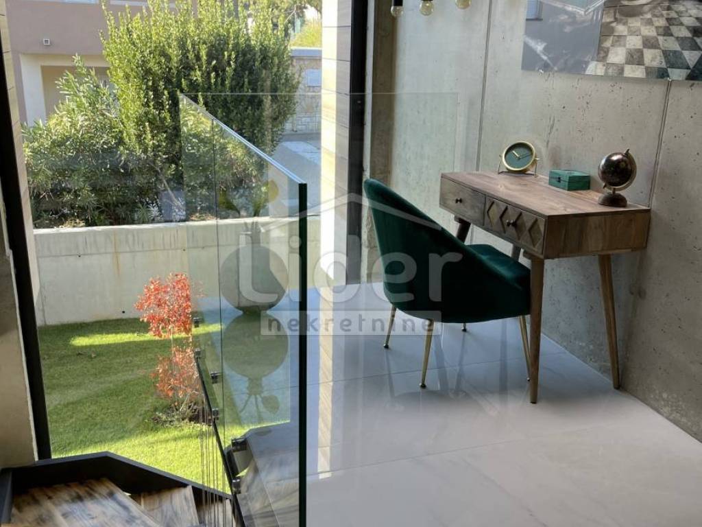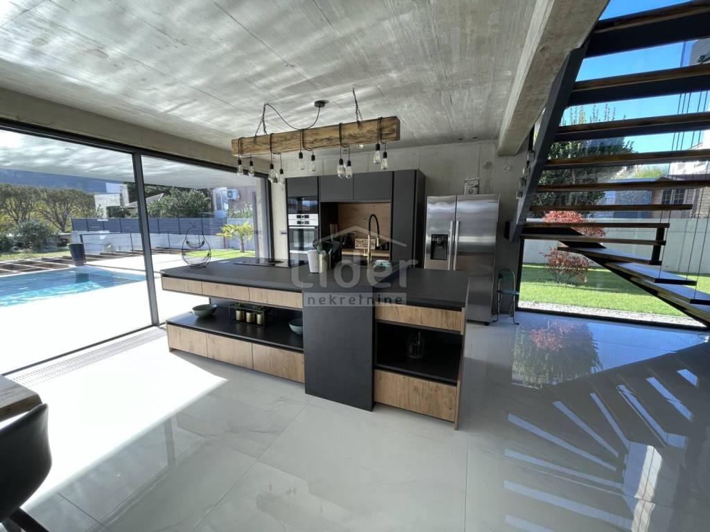 Beautiful urban designer villa fully and luxuriously equipped with all the details that will meet the highest standards with its interior and exterior. The villa consists of three floors. In the basement there is a playroom with TV, wellness (Finnish sauna, jacuzzi, shower) fitness, boiler room with pool engine room and heat pumps brand Daikin x2 pcs. for underfloor heating and underfloor cooling, storage, laundry with washing machine and dryer. An internal and external staircase leads to the ground floor. The ground floor has a toilet, living room and kitchen with dining area which opens onto a spacious semi-covered terrace and pool. Next to the house there is an outdoor covered kitchen with a gas grill and a space for socializing. The first floor consists of 4 bedrooms with private bathrooms. The entire floor exudes contemporary elegance in an industrial style. Two rooms have access to a beautiful and long balcony with a view of nature and greenery. The complete villa is decorated with top quality materials and an irresistible combination of slightly cool colors that are additionally insulated with wooden elements and warm details that make this interior wonderful. A special feature of this property, in addition to top quality materials and luxury, are the glass walls with low-profile frames that allow contact between the interior and the outside space. The staircase is fitted with a fixer-glass wall, the third largest in HR. The villa has low temperature underfloor heating and cooling using heat pumps and fan coilers (3.5kW) in each of the 4 rooms plus 3 in the living room (10kw). Heating and cooling regulation separately for each room and each floor with its own thermostats. Custom made stairs and dining table, chandeliers, custom made sauna and hot tube in the wellness room, Schuco fixed and bathroom joinery, ave sliding walls by Otima minimal frame, leather set Natuzzi, kitchen Dan Kucheni boiler room 80% made of copper and almost 100% isolated. Pool technique includes Hugo Lame countercurrent swimming, massage jets, electrolysis with salt. The pool is designed as an overflow so that it has an automatic water replenishment. Filter cleaning is also automatic (pressure regulated). A water clarification system is installed. The pool is heated by its own heat pump and is covered with an "in ground" roller shutter cover (withstands between 20 and 30 kg). The complete interior ceramics and facade ceramics are from the renowned Italian manufacturer IMOLA. Outdoor and pool ceramics of one of the best Spanish suppliers of pool ceramics ROSA GRESS. The lawn is irrigated with a sprinkler system and drip irrigation (for plants). The horticulture is beautifully designed; palm trees, bonzai olives, cedar were planted. Garden lighting is automatic via Foto-oko with the possibility of limiting the length of lighting work. All rooms are equipped with a TV with antenna, satellite and IPTV connection. Ventilated ceramic facade. Solar system with overheating protection system (Vismann, patented self-dimming). Apart from the fact that the ceramic façade visually fits perfectly into the space with its beauty, the reason for the choice also lies in its resistance to climatic and other mechanical influences. It has 4 outdoor covered parking spaces. Solar panels are installed on the roof terrace and there is a possibility of making a roof terrace overlooking the sea. The new owners will enjoy taking full advantage of such luxuriously equipped villas.