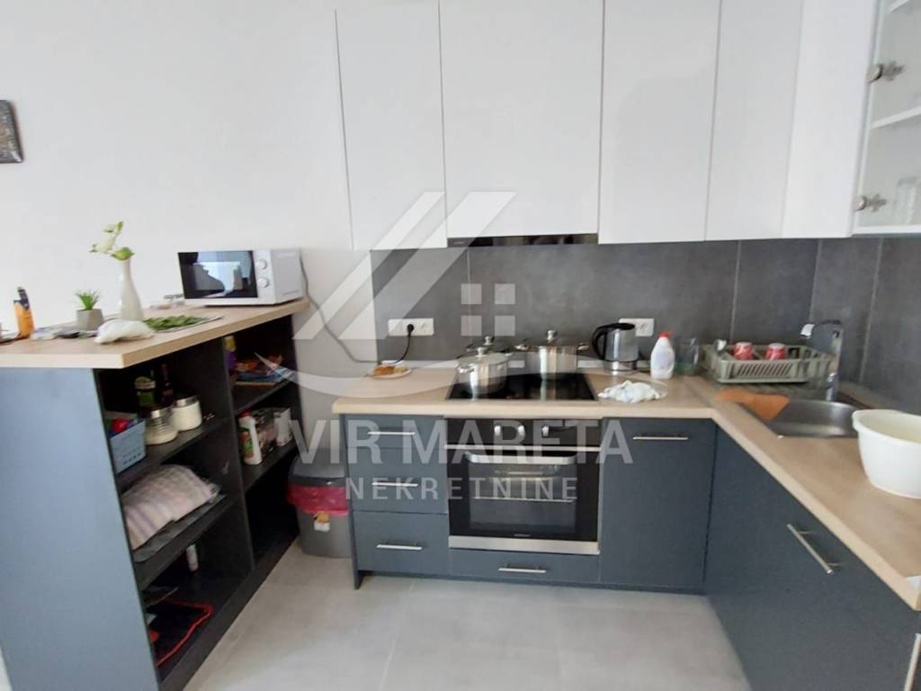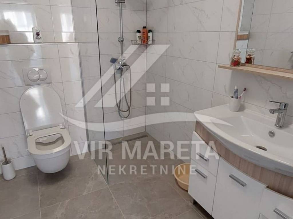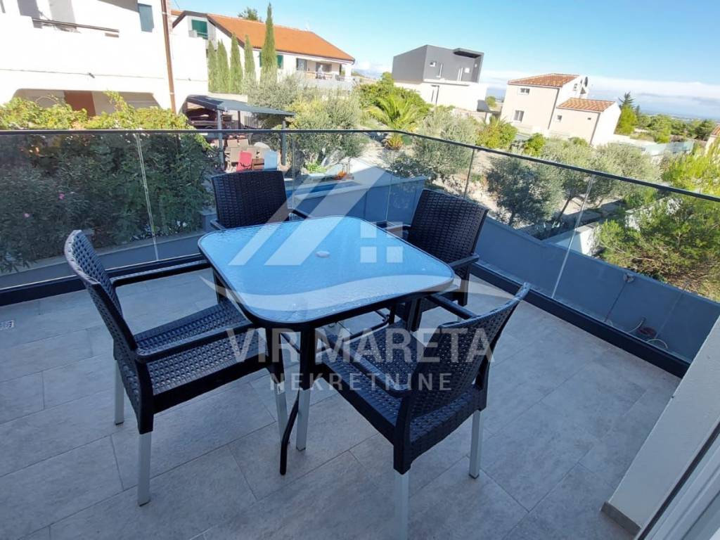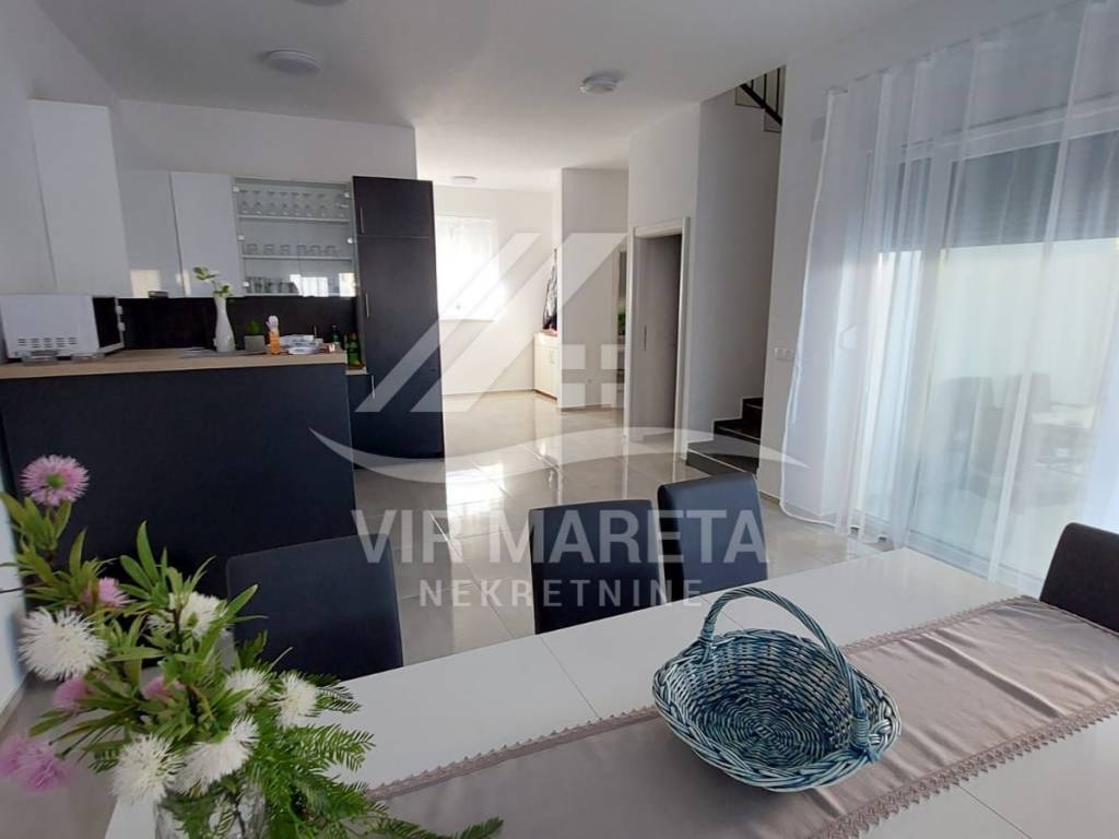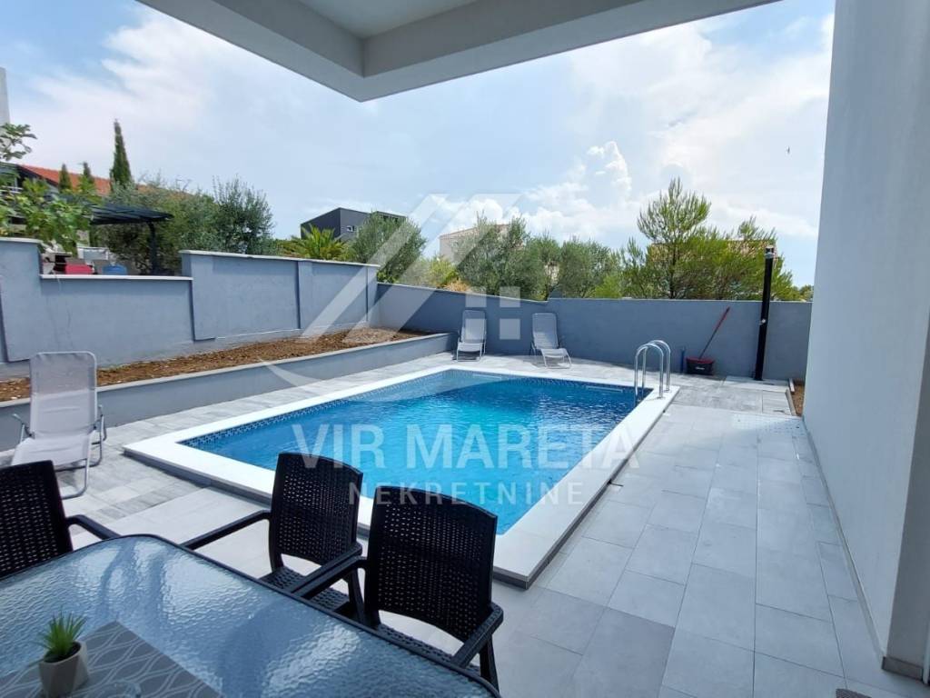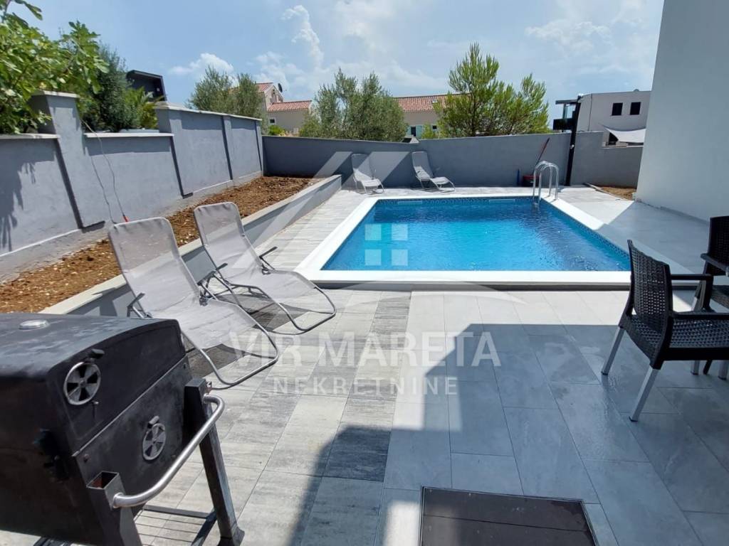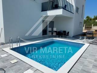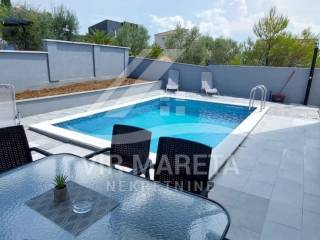 Luxury house with swimming pool for sale, south side in a quiet place. The house consists of two floors. On the ground floor there is a spacious living room with a sliding wall that leads to the courtyard with a swimming pool, a kitchen with a dining room, a living room, a toilet, two storage rooms, and a laundry room. The internal staircase leads to the first floor. Upstairs there are three bedrooms and 2 bathrooms, one of which belongs to the master bedroom. On the first floor there is also a terrace with a view of the sea and the islands. The property is sold fully furnished and equipped. The house has a water tank and an airtight septic tank for waste water. The house is built with the highest quality materials. Distance from the beach 1300 m. Possible agreement on the price.