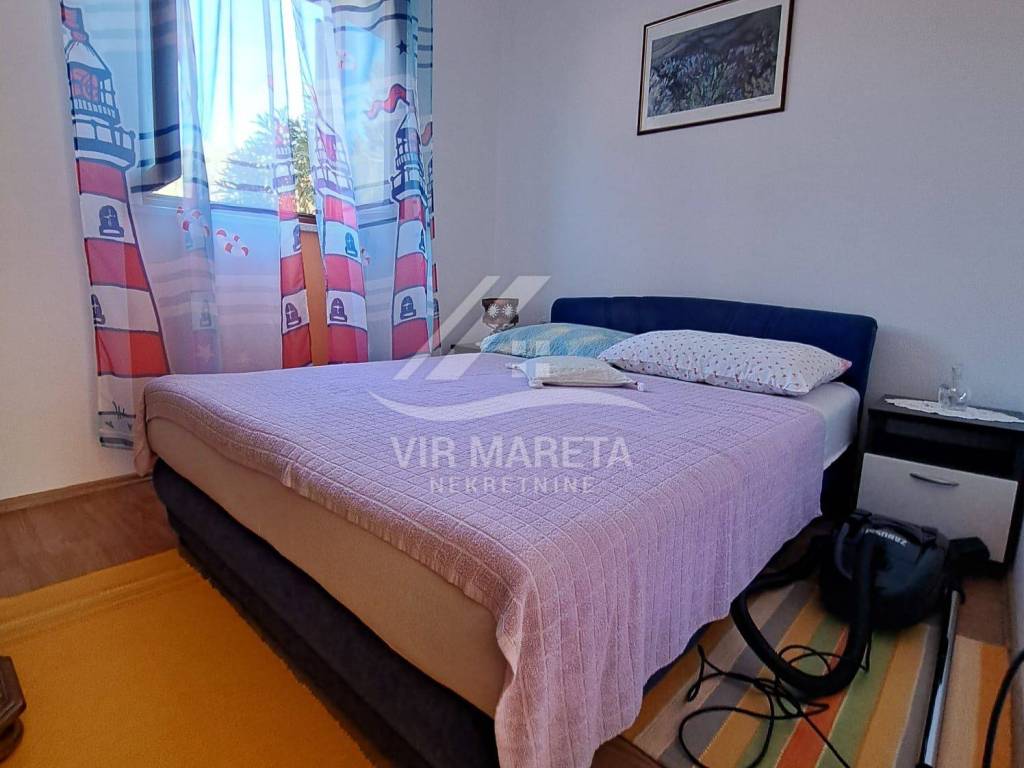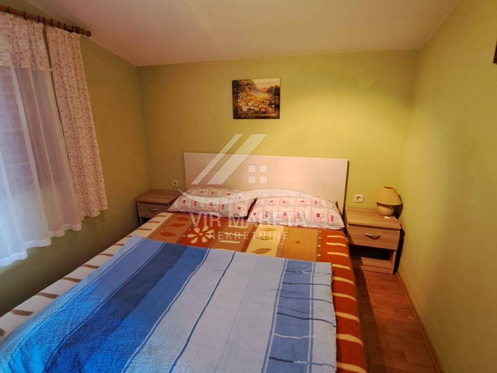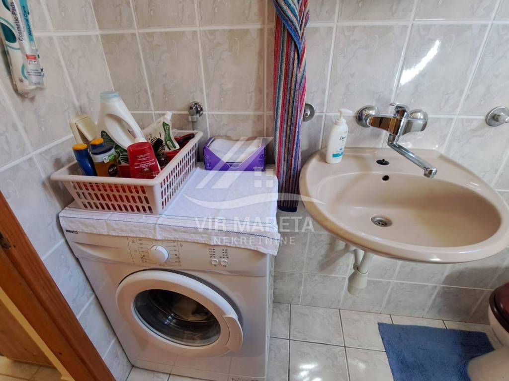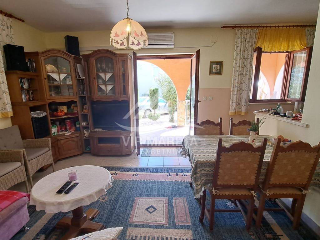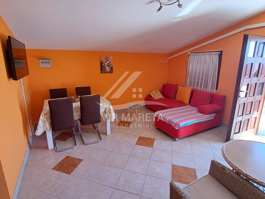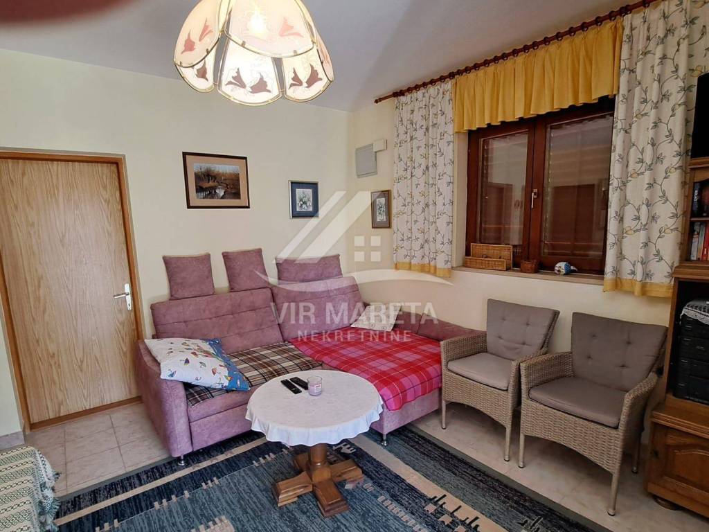 The ground floor consists of a kitchen with a living room, two bedrooms, a bathroom and a large covered terrace. The apartment is fully furnished and air-conditioned, a custom-made kitchen with appliances, one bedroom has a TV, the bathroom has a washing machine and a new hot water boiler.