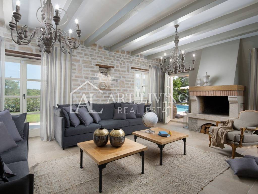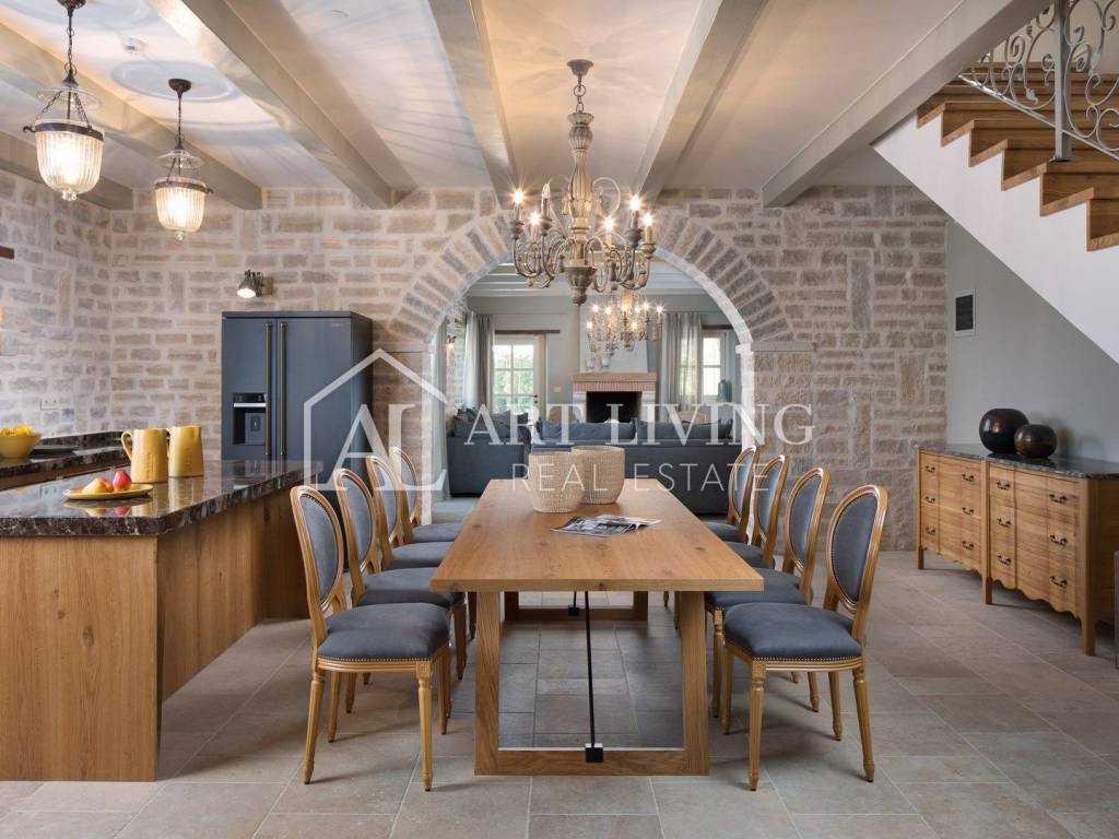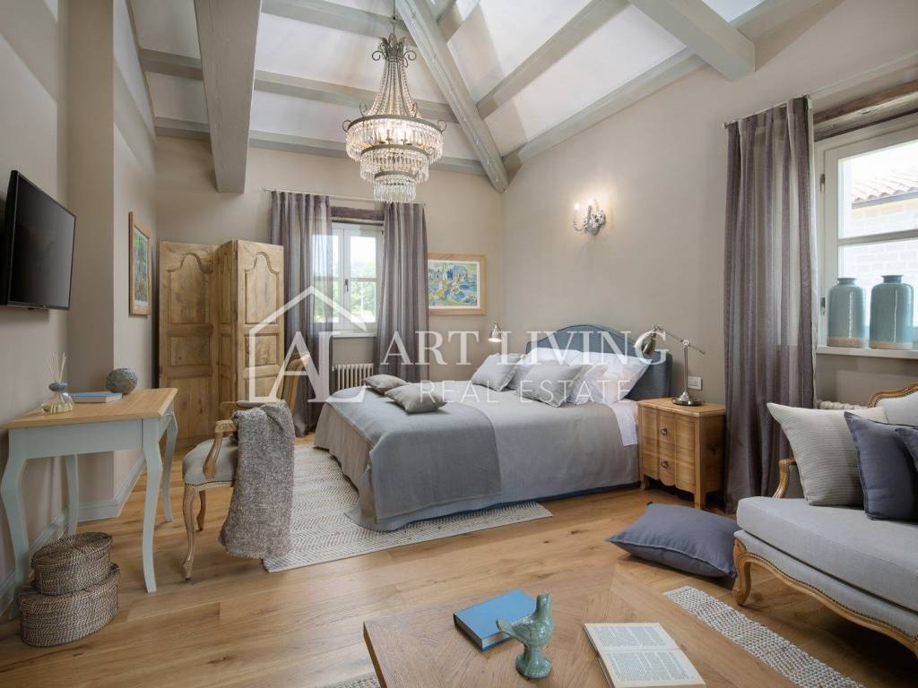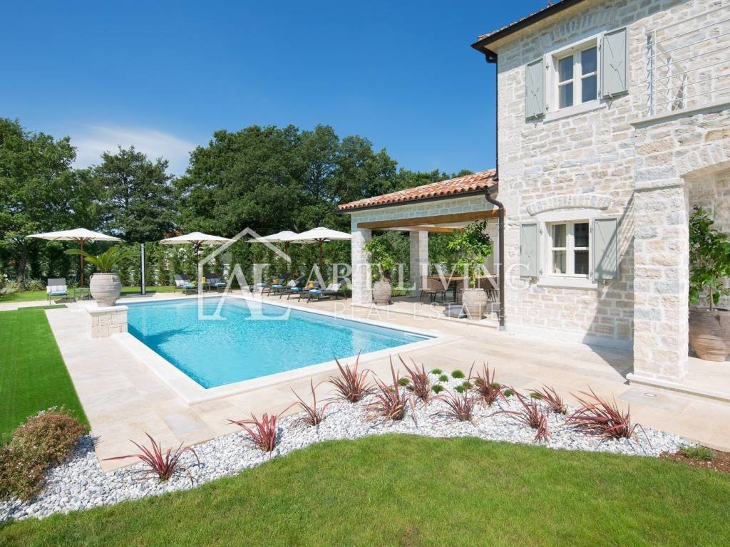 For sale is a designer furnished stone villa with pool in central Istria, 23 km from Poreč and 26 km from picturesque Rovinj. The villa is luxuriously furnished and furnished with rustic furniture. The villa has a high level of comfort and from the balcony on the first floor there is a beautiful panoramic view of the sea.