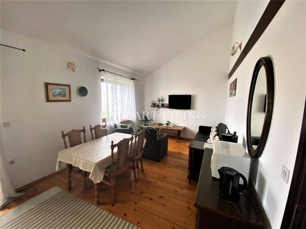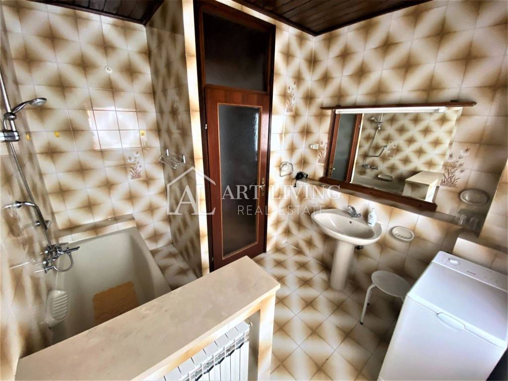 The first floor with a separate entrance hall consists of an axis of stairs leading to the first floor where two separate apartments are located. One apartment has a spacious living room with dining area and open kitchen and exit to the balcony. From the living room there is direct access to the beautiful large terrace with a view of the greenery and nature as well as from the bedroom that belongs to this apartment. The apartment also has a bathroom and storage.