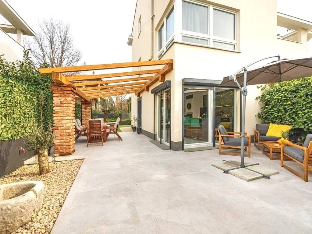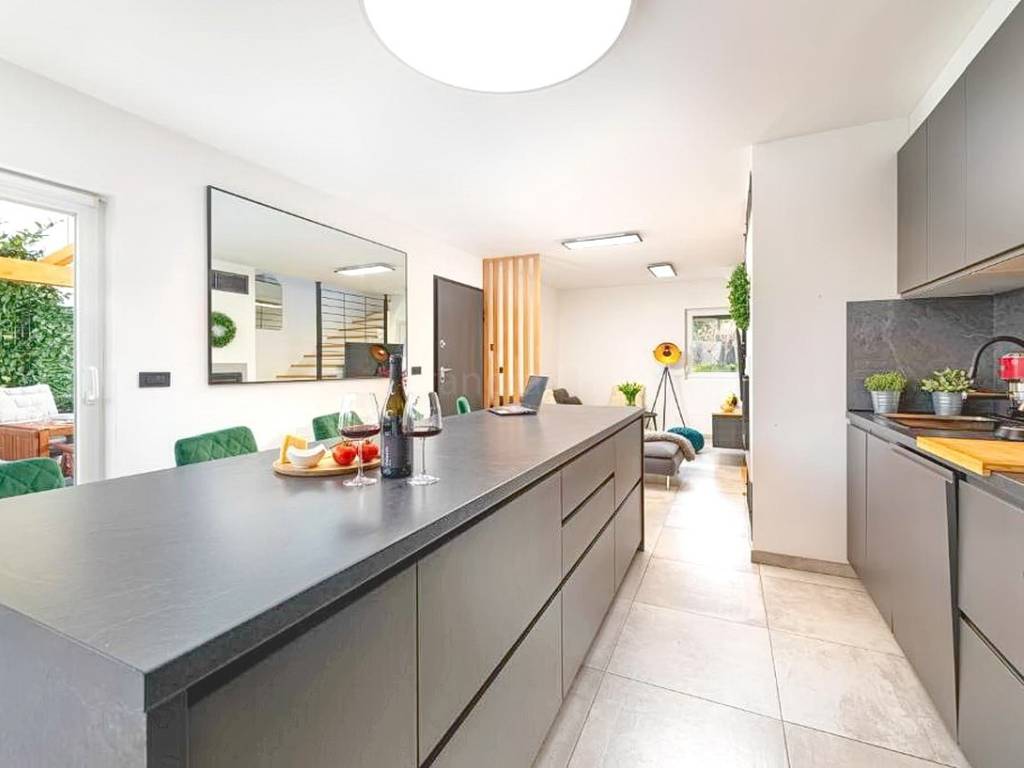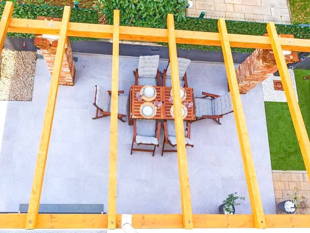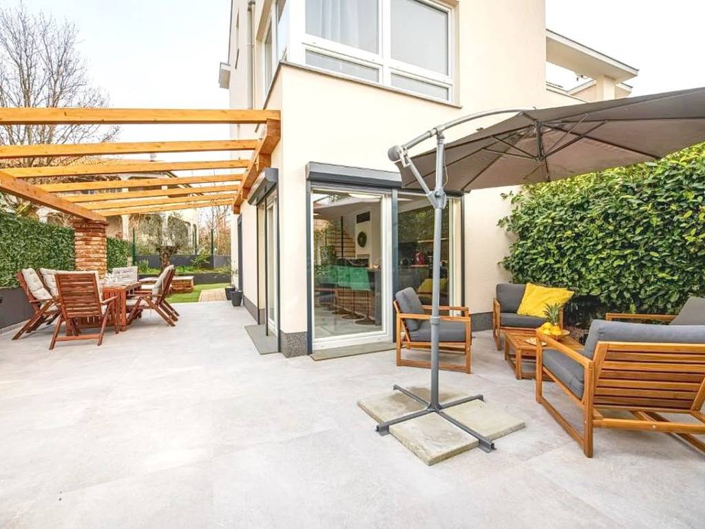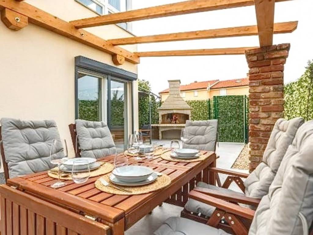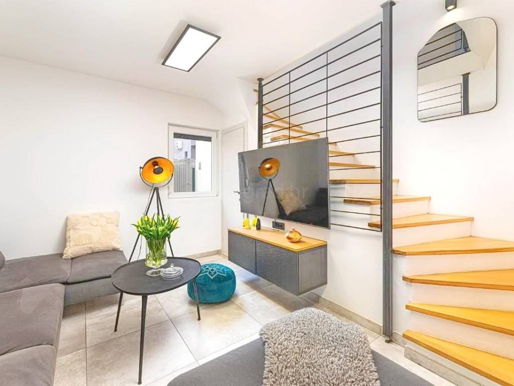 The property also includes a landscaped garden of 100 square meters with a built-in outdoor fireplace, enhancing the overall living experience. In addition, the apartment comes with ownership of two dedicated parking spaces, which is a valuable advantage given the location.