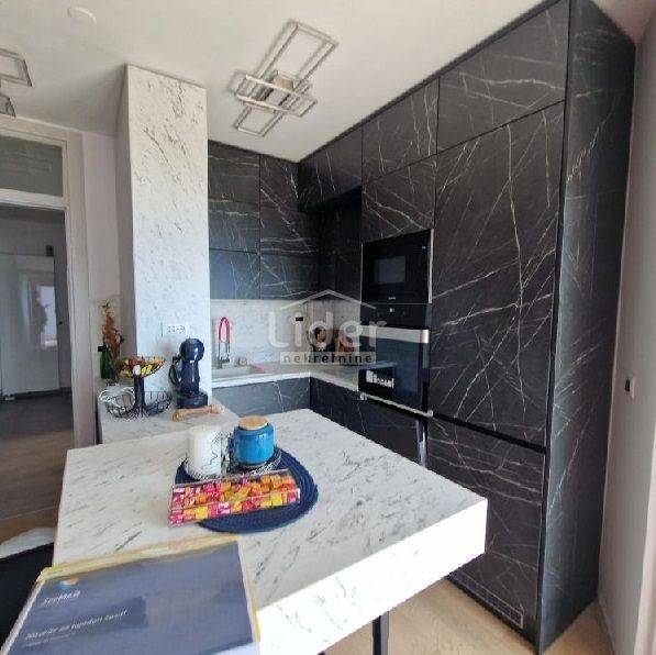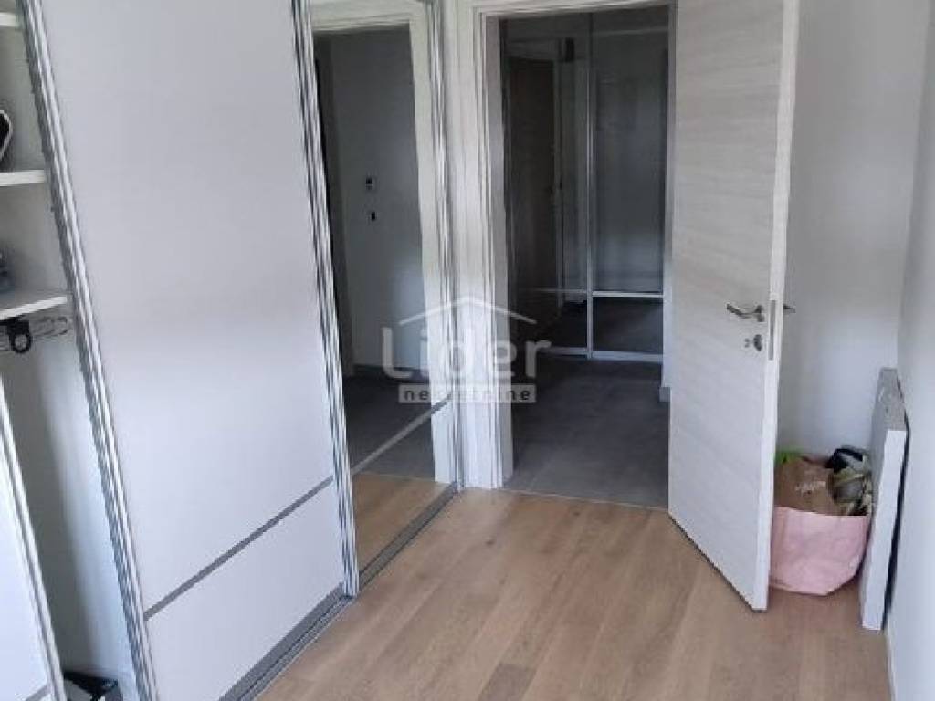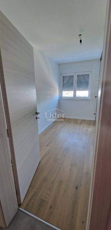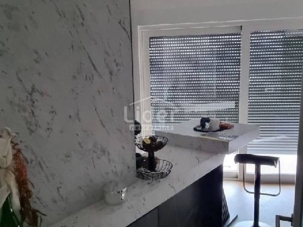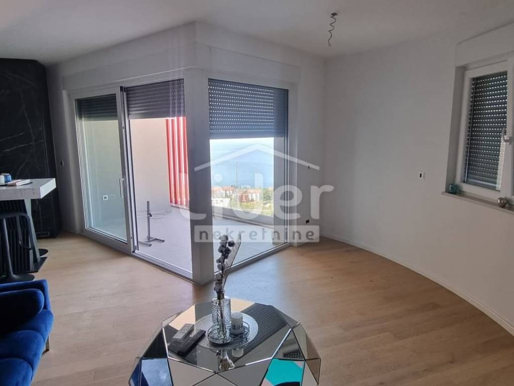 Martinkovac, newly built, modernly furnished apartment, 76.80 m² in size, with a beautiful view. It consists of a kitchen with a dining area and living room, two bedrooms, a bathroom, hallway, loggia, and storage room. The smaller room is set up as a walk-in closet, with the possibility to place a smaller 90x200 bed or a desk. The apartment is double-oriented to the north and mostly to the northwest, ensuring plenty of sunlight in the living room during the afternoon hours, which opens onto a loggia with a wonderful sea view. From the loggia, there is a beautiful panoramic view of Opatija, the Rijeka Bay and islands, as well as the hilly hinterland. The bedrooms are oriented to the north. Hot water is supplied via the boiler room. The apartment is fully equipped with underfloor heating. Each room has its own thermostat. An air conditioner is installed in the living room. The building has video surveillance and a fire alarm system. The apartment comes with two garage parking spaces with a total area of 25 m².