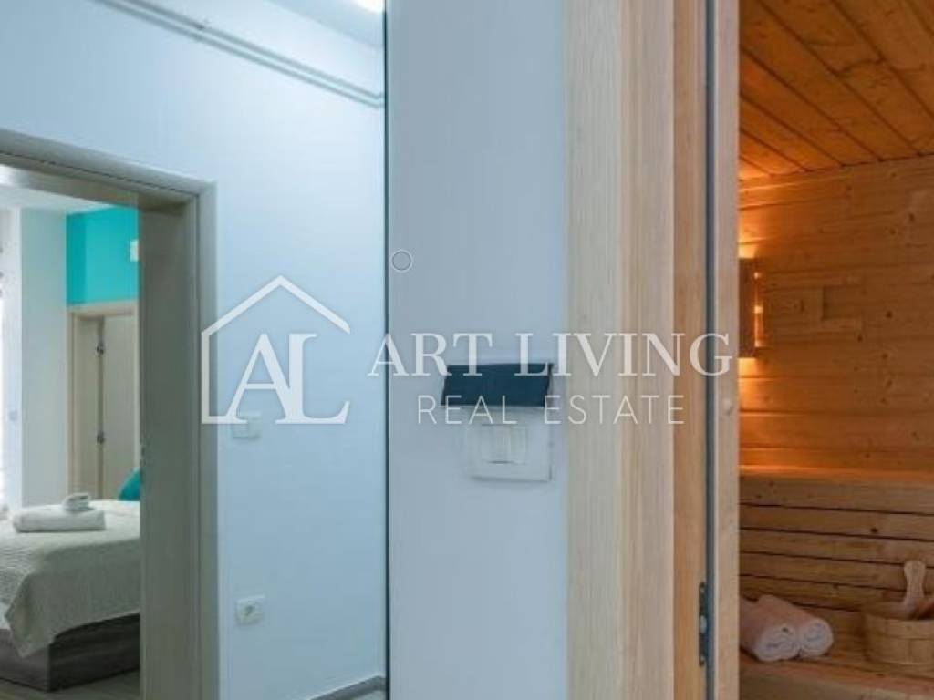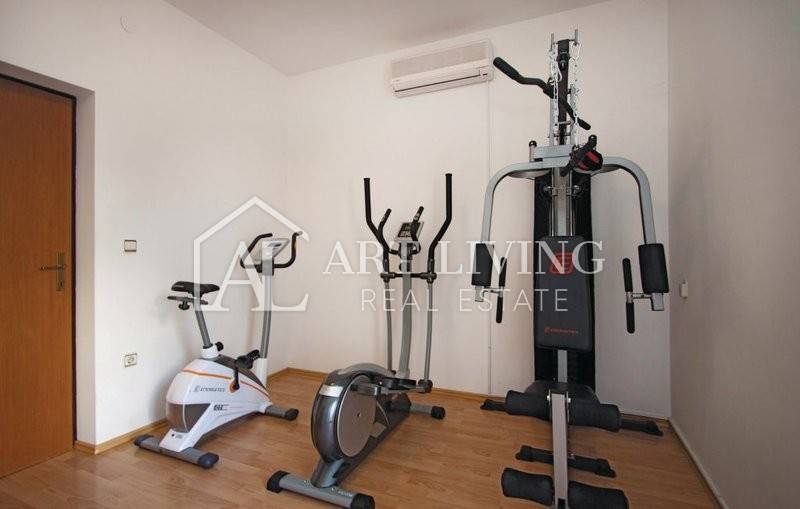 The ground floor consists of an entrance hall, two bedrooms, two bathrooms, sauna, wellness, gym and laundry room.