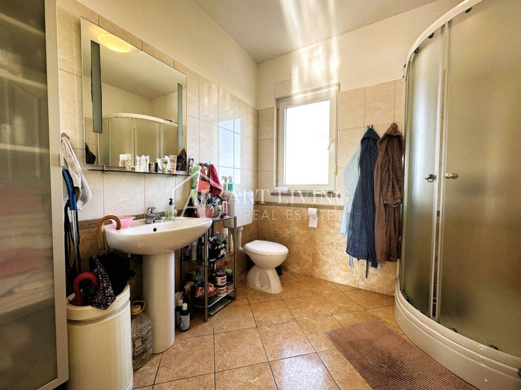 The apartment with a total net area of 79 m2 is located on the first floor of a smaller residential building with 6 apartments and consists of a hallway, a spacious living room with a dining room, a kitchen, 2 bedrooms and a bathroom. The living room leads directly to a beautiful covered terrace, sunny all day long, with a view of the sea, greenery and soothing nature.