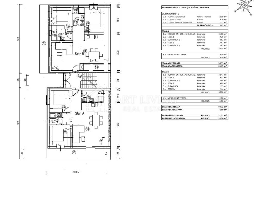 The total area of ​​the apartment itself is 66.45 m2, and it consists of: 2 bedrooms, 2 bathrooms, a storage room, a spacious open-concept living area with a kitchen, dining room and living room, and a large covered terrace with a view of the sea.