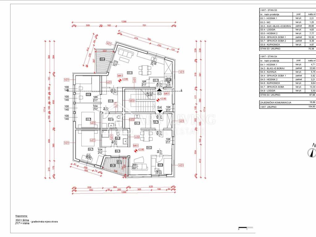 The apartment on the 1st floor, with a total area of 67.66 m2, consists of a hallway, an open-space living room with a kitchen and dining room, 2 bedrooms, and a bathroom.