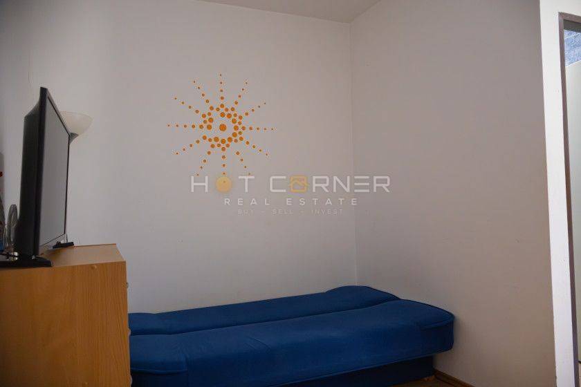 For sale: a small apartment of 25.32 m² with a nice and functional layout consisting of a bathroom, open space combining kitchen, dining area, and living room with a pull-out sofa that can serve as a bed for 1-2 people. The apartment also has a separate bedroom with a double bed and an additional bed for two more people. The bedroom opens onto a peaceful loggia (5.76 m²), ideal for relaxing, with a view of greenery that provides natural shade. In front of the loggia, there is nature and no nearby buildings – you can see the sea through the greenery. Free parking is available in the building’s yard next to the apartment.