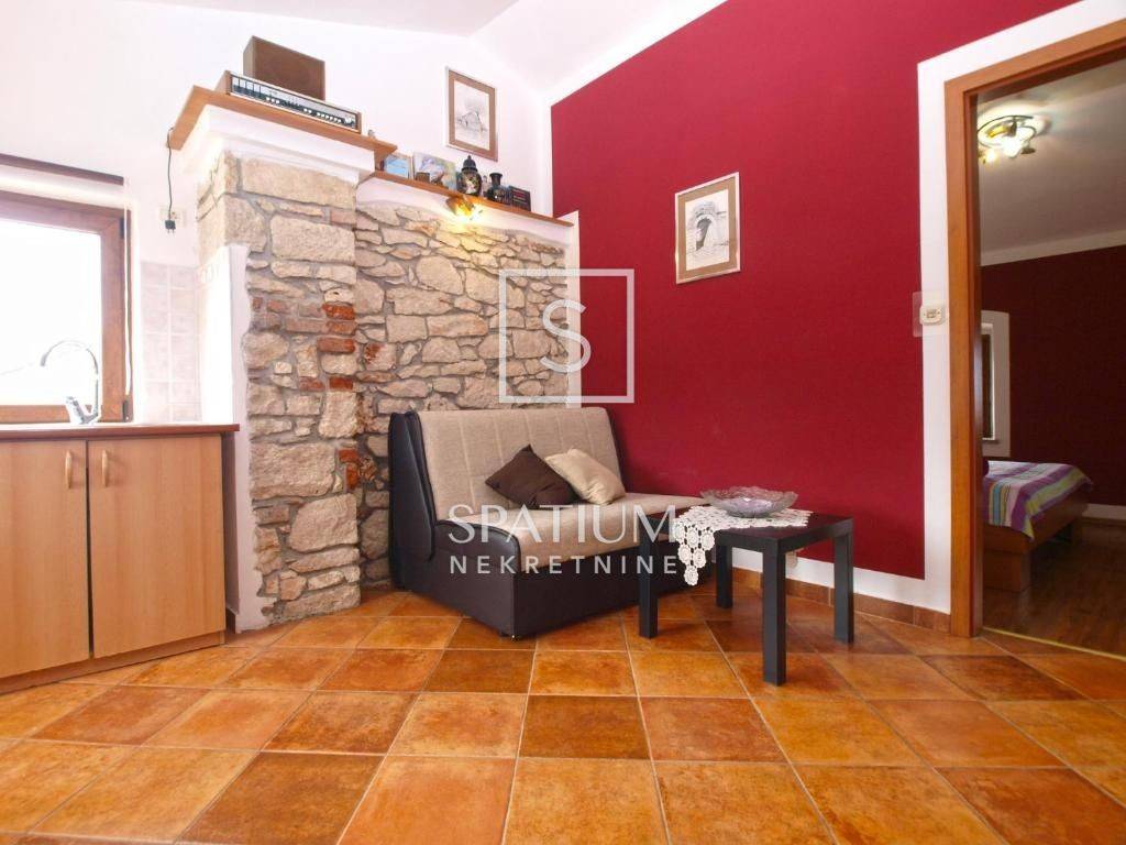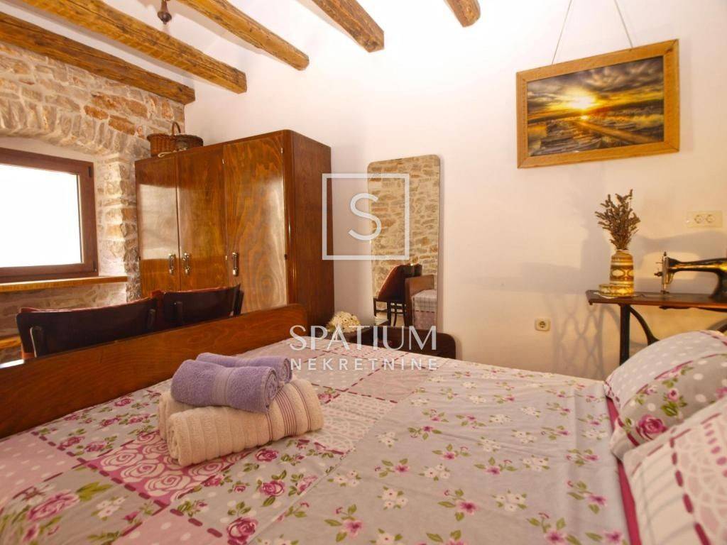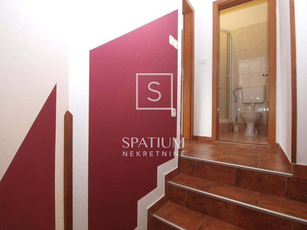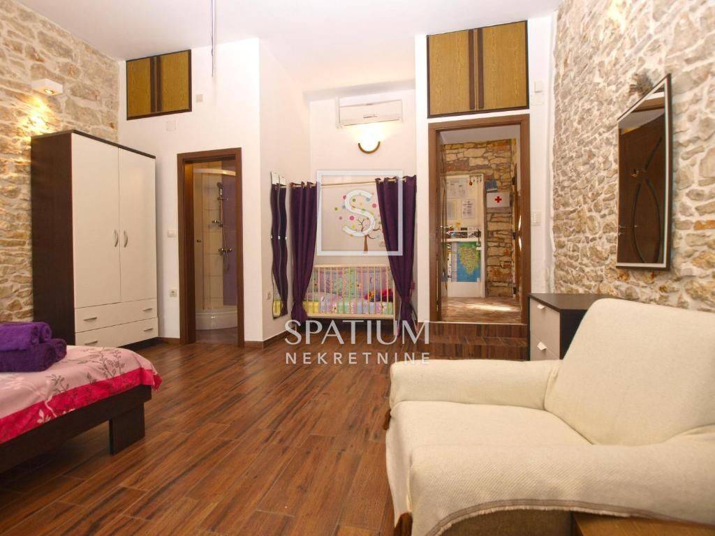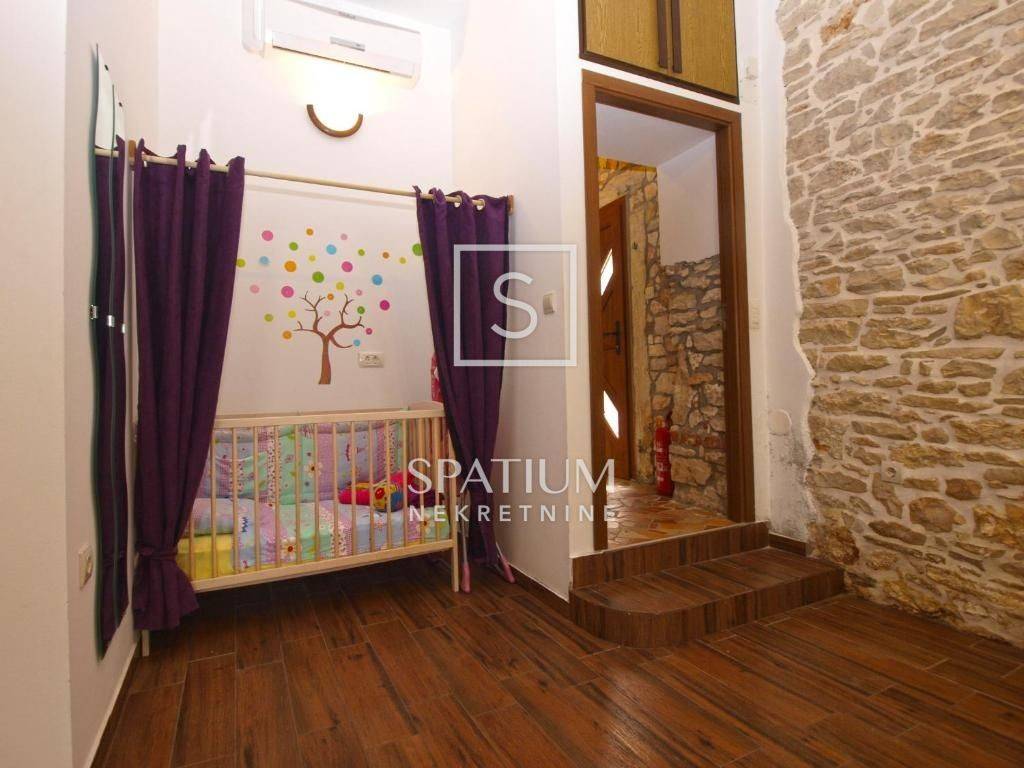 MEDULIN, we have received a stone house with a living area of 150 m2 and a garden of 200 m2. On the ground floor there is a large room with a bathroom and installations for kitchen connections. It contains a garage with a utility room that is currently used as a tavern. From the hallway you enter the yard where there are external stairs leading to the first floor. On the first floor there is a room with a terrace, hallway, bathroom, living room, and installations for kitchen connections have also been carried out. Internal stairs lead to the attic where there is a bathroom, living room with kitchen and bedroom. Considering that the property is located a few minutes walk from the first beaches and summer facilities, it is ideal as an investment for tourist rental.