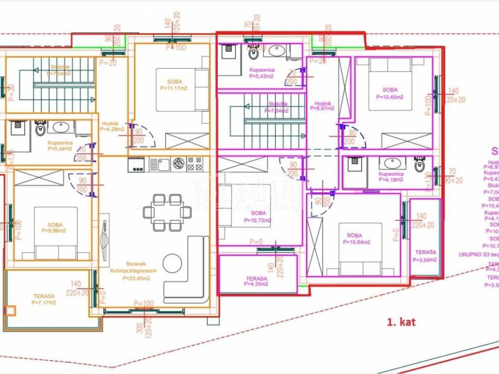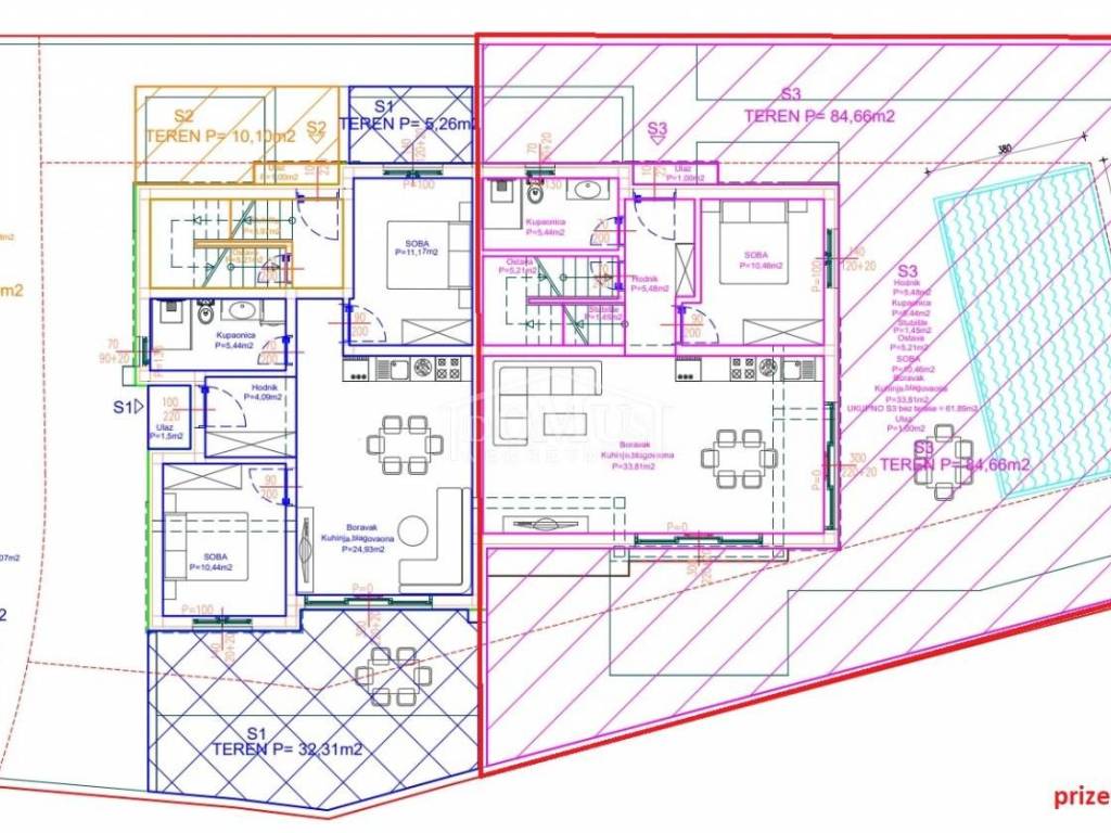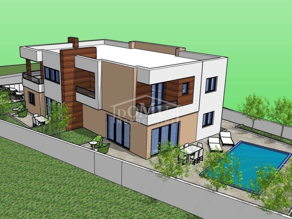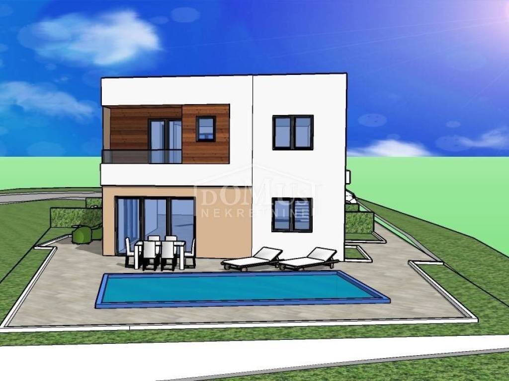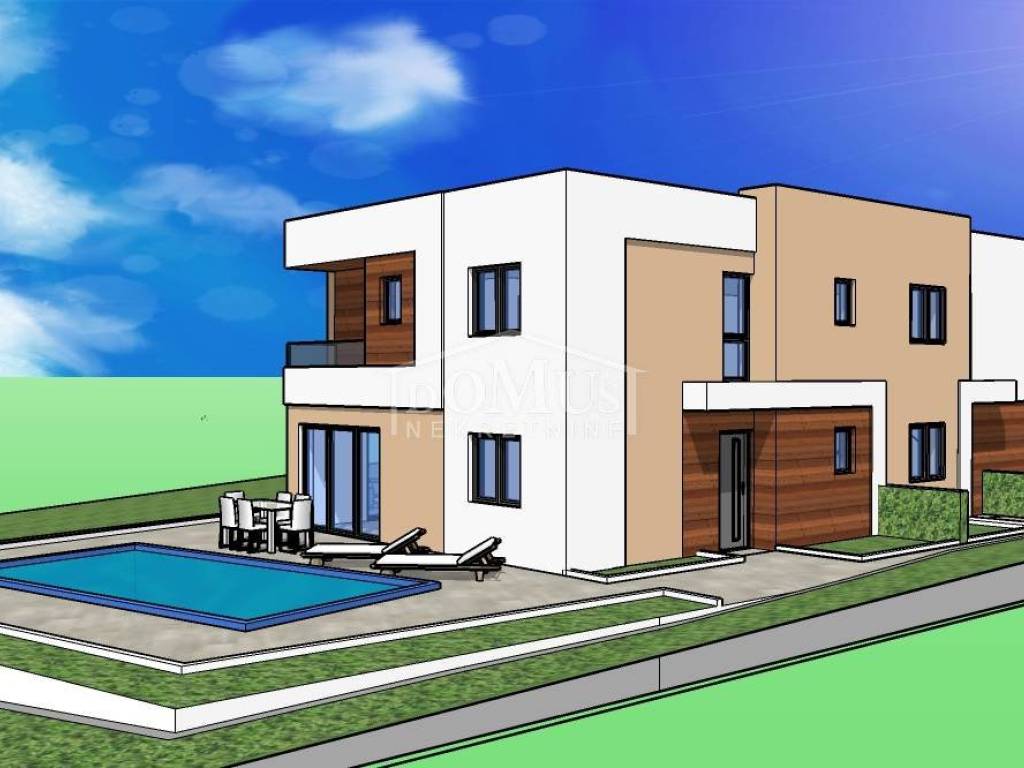 Newly built, family house with an excellent and functional layout in a quiet location with a swimming pool and yard. The house is a double building, on two floors (ground floor + 1st floor). On the ground floor of 61.85m2 there is an entrance, hallway, pantry, bathroom, bedroom and spacious kitchen with dining room and living room as a whole with access to the terrace/courtyard. The internal stairs lead to the 1st floor of 59.57m2, where there is a hallway, a bathroom, three bedrooms (one with a terrace and one with its own bathroom and terrace. The house will be equipped with security doors, PVC carpentry with mosquito nets and electric shutters lifts, high-quality ceramic floor covering, underfloor heating in all bathrooms and living room, air conditioning in the living room and in all bedrooms, telephone and Internet installations, satellite TV. The area of the yard is 188 m2, where there is also a 21m2 swimming pool and a parking space. It is 900 m from the sea and the center, and 1,000 m from the landscaped Vruje beach. Move-in spring 2026.