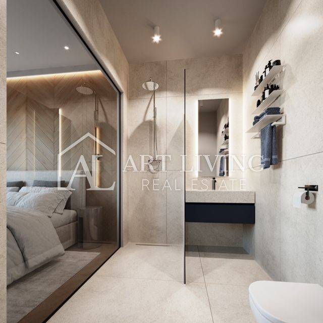 A modern two-story, three-room apartment with its own pool and garden is for sale.