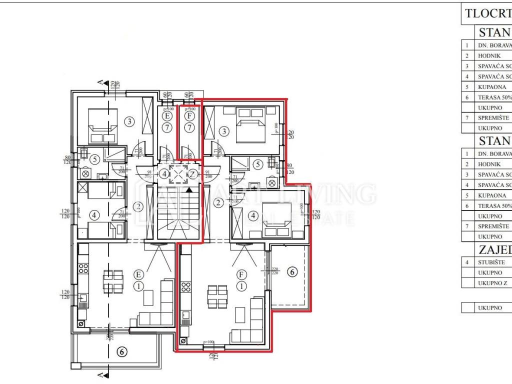 The apartment of 66.84 m2 consists of an entrance hall, a living room with an open kitchen and dining room, two bedrooms and a bathroom. The living room leads directly to a covered terrace of 6.10 m2 with a view of the Istrian landscape.