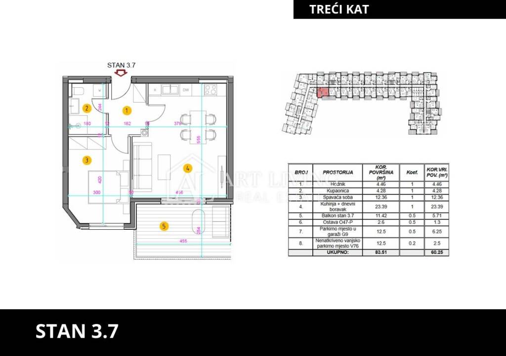 The apartment is located on the 3rd floor of a new modern building with an elevator. The total area of ​​the apartment is 60.25 m2. It consists of a living room with kitchen and dining room, bathroom and bedroom. The living room opens onto a balcony of 11.42 m2. The apartment includes a storage room, one parking space in the garage and one outdoor uncovered parking space.
