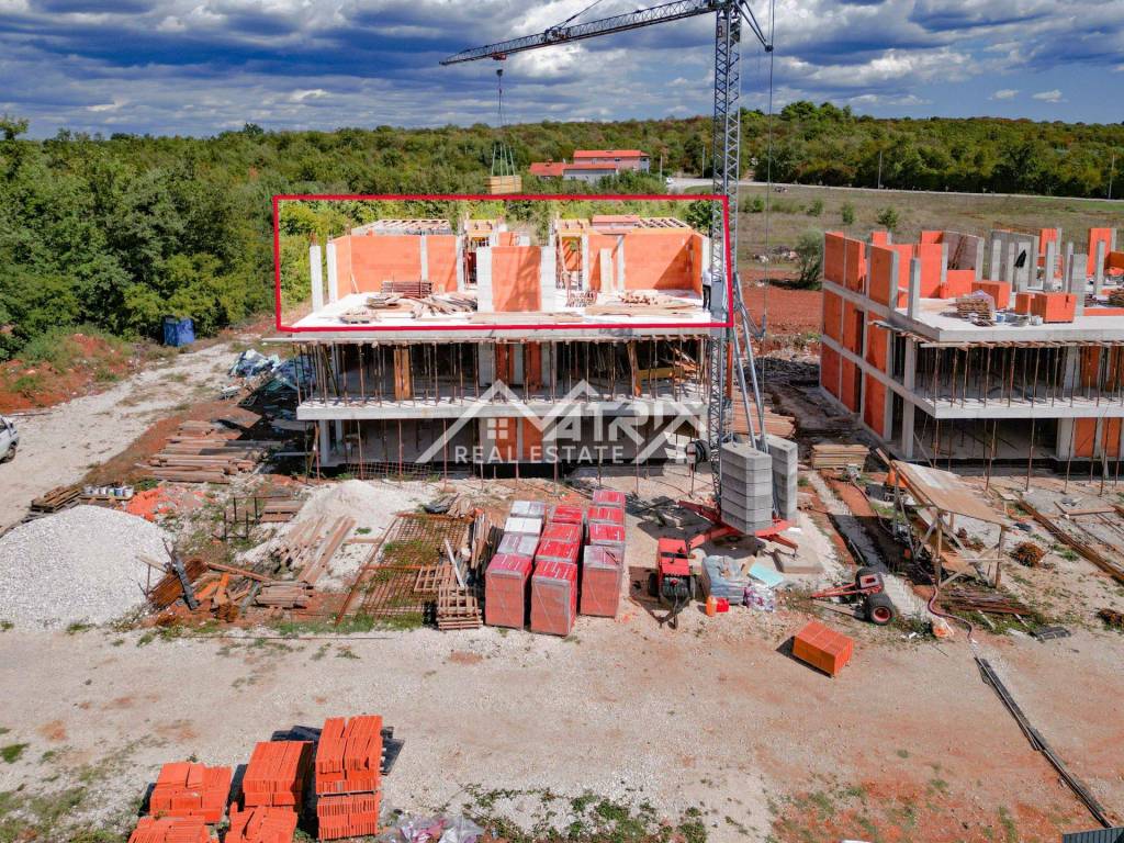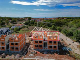 A spacious penthouse under construction is for sale, located in a sought-after location just 2 km from the center of Poreč. This modern new build offers 153.35 m² of net living space, including a spacious living room with a dining area and kitchen, four comfortable bedrooms, two bathrooms, a separate toilet, a utility room, and a laundry room. The master bedroom features its own bathroom and walk-in closet.