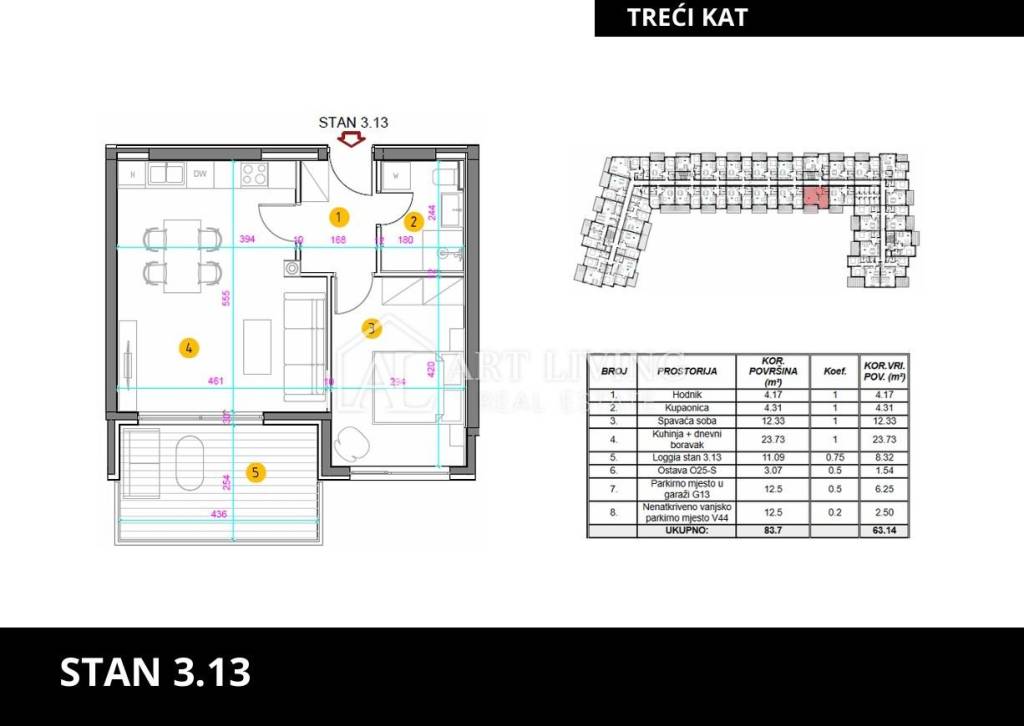 The apartment is located on the 3rd floor of a new modern building with an elevator. The total area of ​​the apartment is 63.14 m2. It consists of a living room with kitchen and dining room, bathroom and bedroom. The living room opens onto a balcony of 11.09 m2. The apartment includes a storage room, one parking space in the garage and one outdoor parking space.