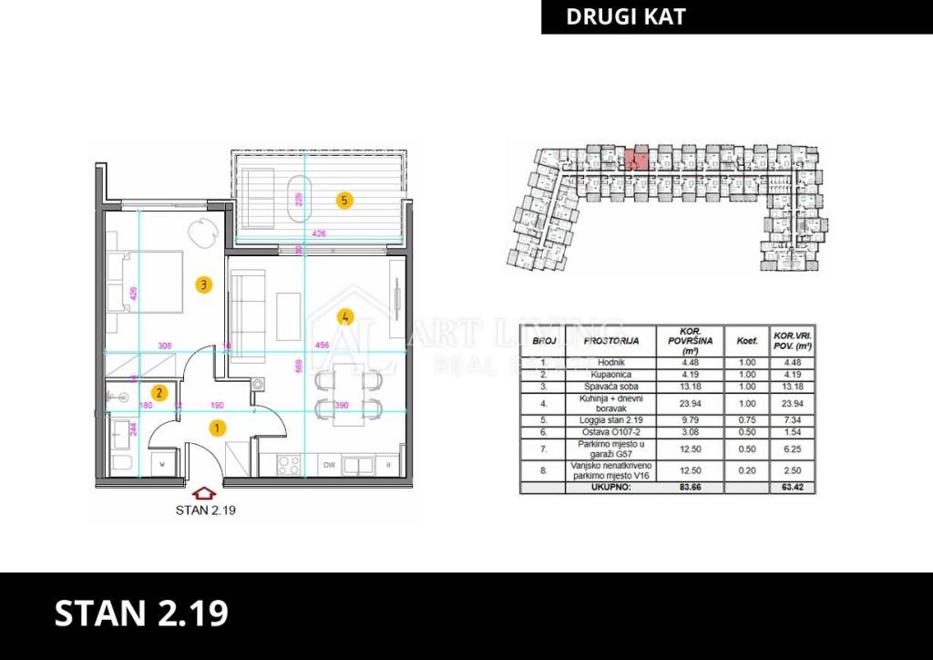 The apartment is located on the 2nd floor of a new modern building with an elevator. The total net area of ​​the apartment is 63.42 m2. It consists of a living room with kitchen and dining room, bathroom and bedroom. The living room opens onto a balcony of 9.83 m2. The apartment includes a storage room, one parking space in the garage and one outdoor parking space.